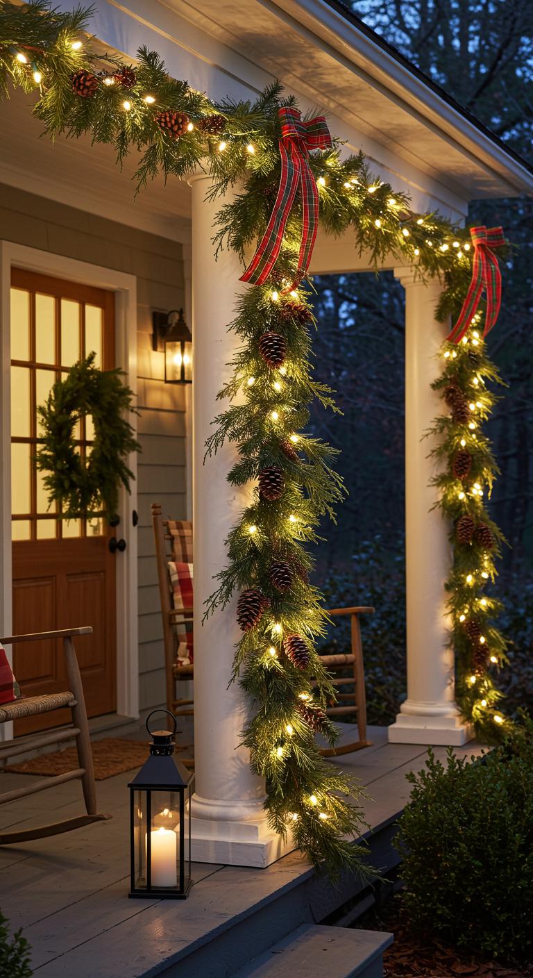 Wrap a lush evergreen garland around each porch column to instantly give your entry a classic holiday look that’s both sturdy and welcoming.