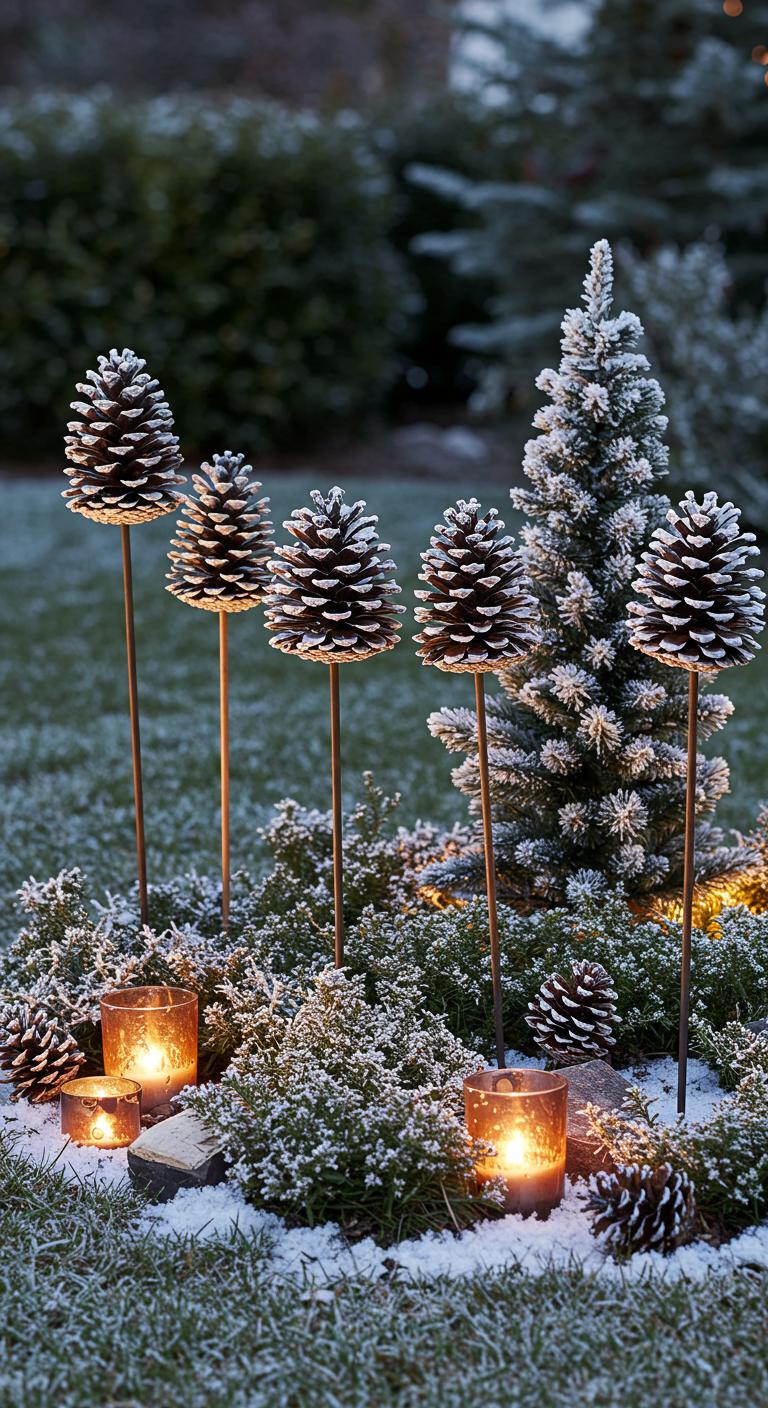 When you tuck frosted pinecone stakes into garden beds, they add a wintry sparkle that’s low-effort but high-impact; collect sturdy pinecones, attach them to blunt wooden or metal stakes, and lightly flock or spray them with faux snow so they catch evening lights without falling apart.