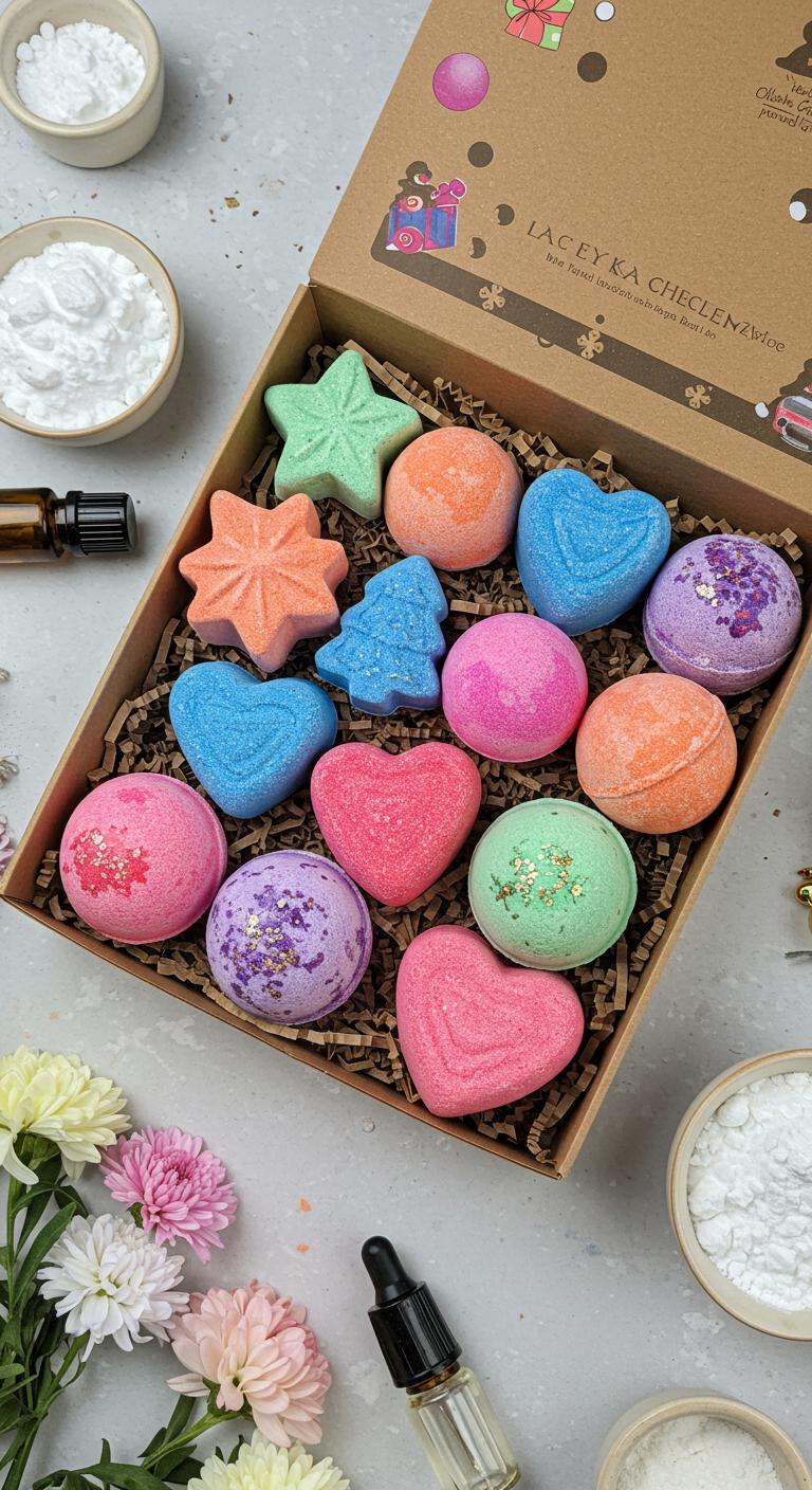Mix baking soda, citric acid, and your favorite fragrant essential oils for a delightful aroma. Mold them into shapes, and don’t forget to use festive packaging to make them extra special.