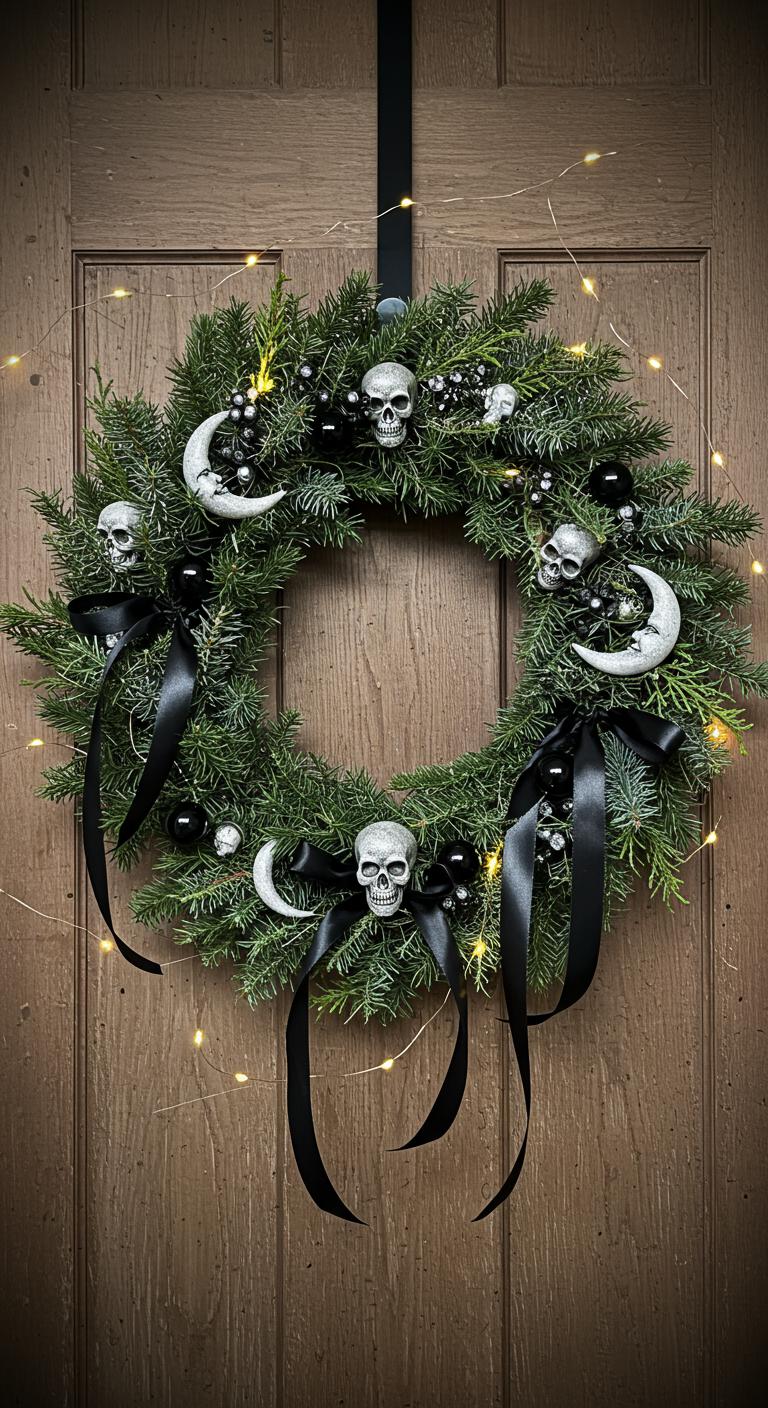 Create a spellbinding evergreen wreath using inexpensive fresh or faux evergreens. Gather some black satin ribbons, small ornaments, and decorative charms. Use a wire frame to attach the decorations and greenery. The key is mixing textures—combine shiny ornaments with natural pine for an enchanting effect. Look for ornaments at discount stores or use things you already own. Drape a strand of fairy lights around the wreath for an added glow. Hang it on your door to greet friends and family with a mysterious welcome!