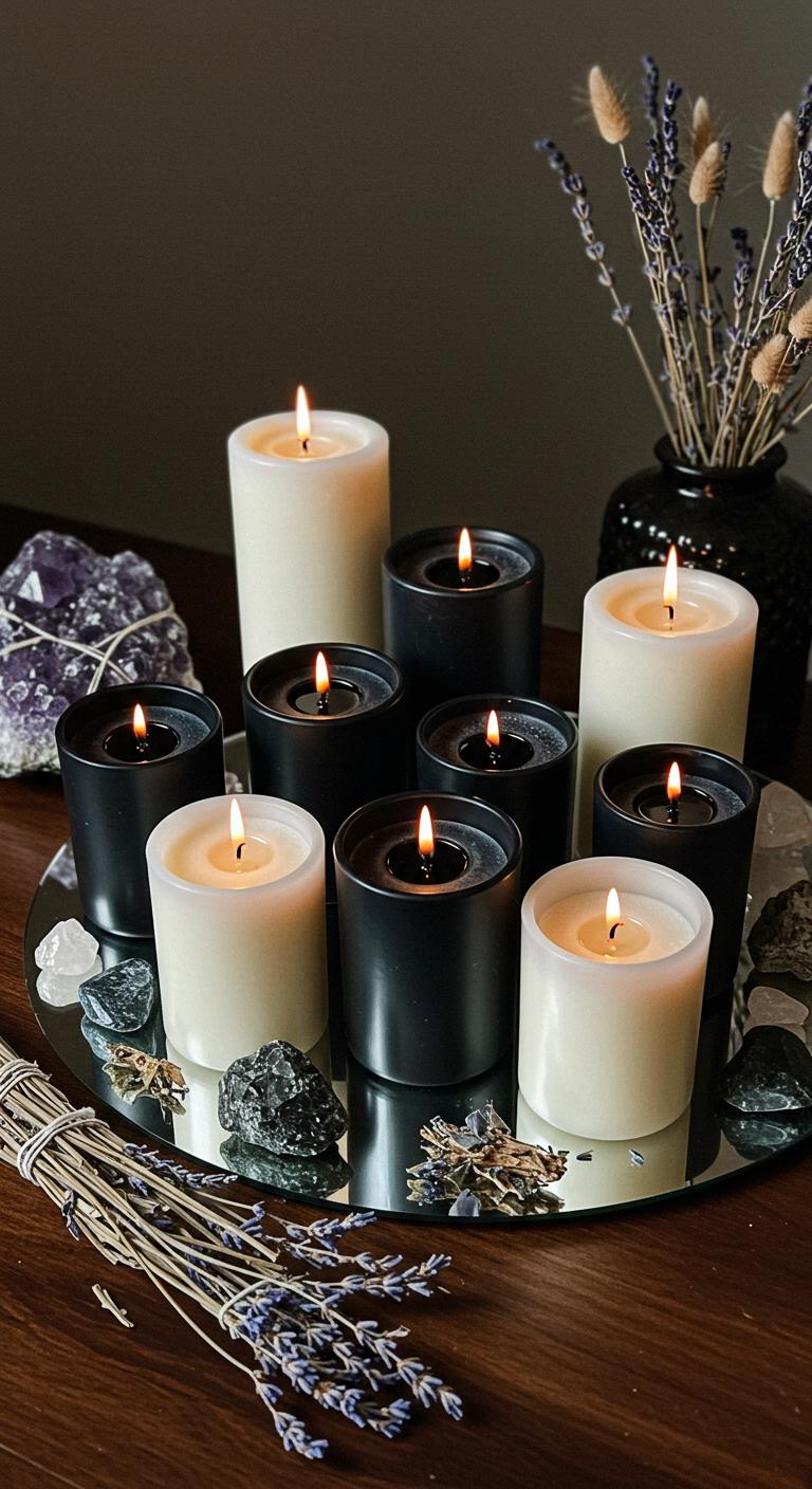 Transform your space with mystical candle displays. Collect black, white, or deep-colored candles. Arrange them on a mirrored tray or a rustic wood board for a cozy vibe. Add in crystals like amethyst or quartz and some dried herbs, such as sage or rosemary, for an earthy touch. Consider using thrifted candlesticks for a vintage flair. Light them during your Yuletide gatherings to create a warm, inviting atmosphere—perfect for storytelling or meditative evenings.