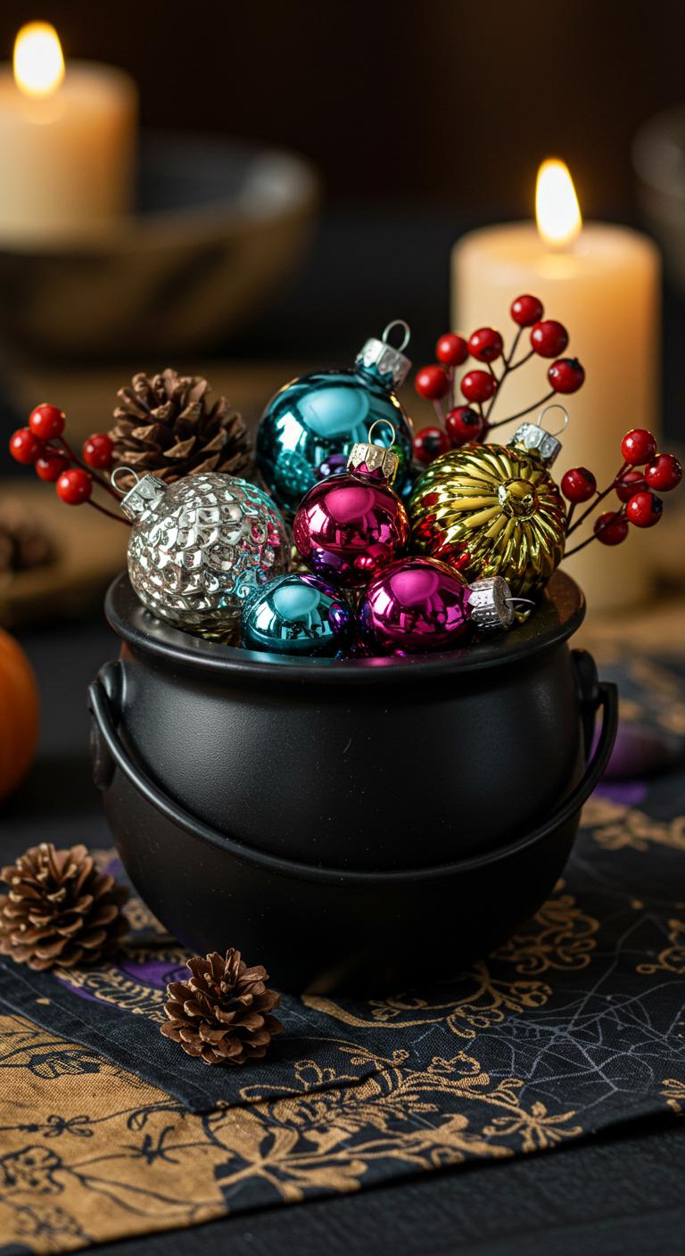 Put an old cauldron to use as an ornament holder this Christmas! If you don’t have one, check thrift stores for affordable options. Fill it with an assortment of decorations like glass baubles, pinecones, or dried fruits. This gives a unique touch, combining festive cheer with a witchy vibe. Alternatively, paint a small pot black and use that instead. Place your cauldron on a decorative tablecloth in earthy tones for a warm aesthetic.