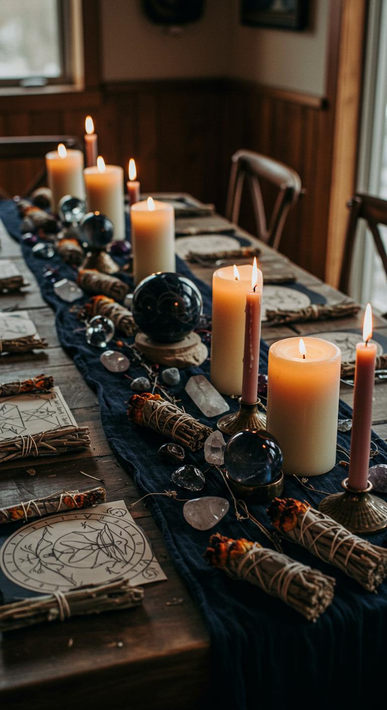 Create a stunning centerpiece using elements from nature! Start with a dark or metallic table runner to set the mood. Use old glass jars or candlesticks of varying heights filled with candles as focal points. Surround them with crystals, dried flowers, or even seasonal fruits like pomegranates. This budget-friendly hack allows you to switch up your decor easily each season, keeping the vibe fresh. Just be careful with the candles, and always supervise them when lit!