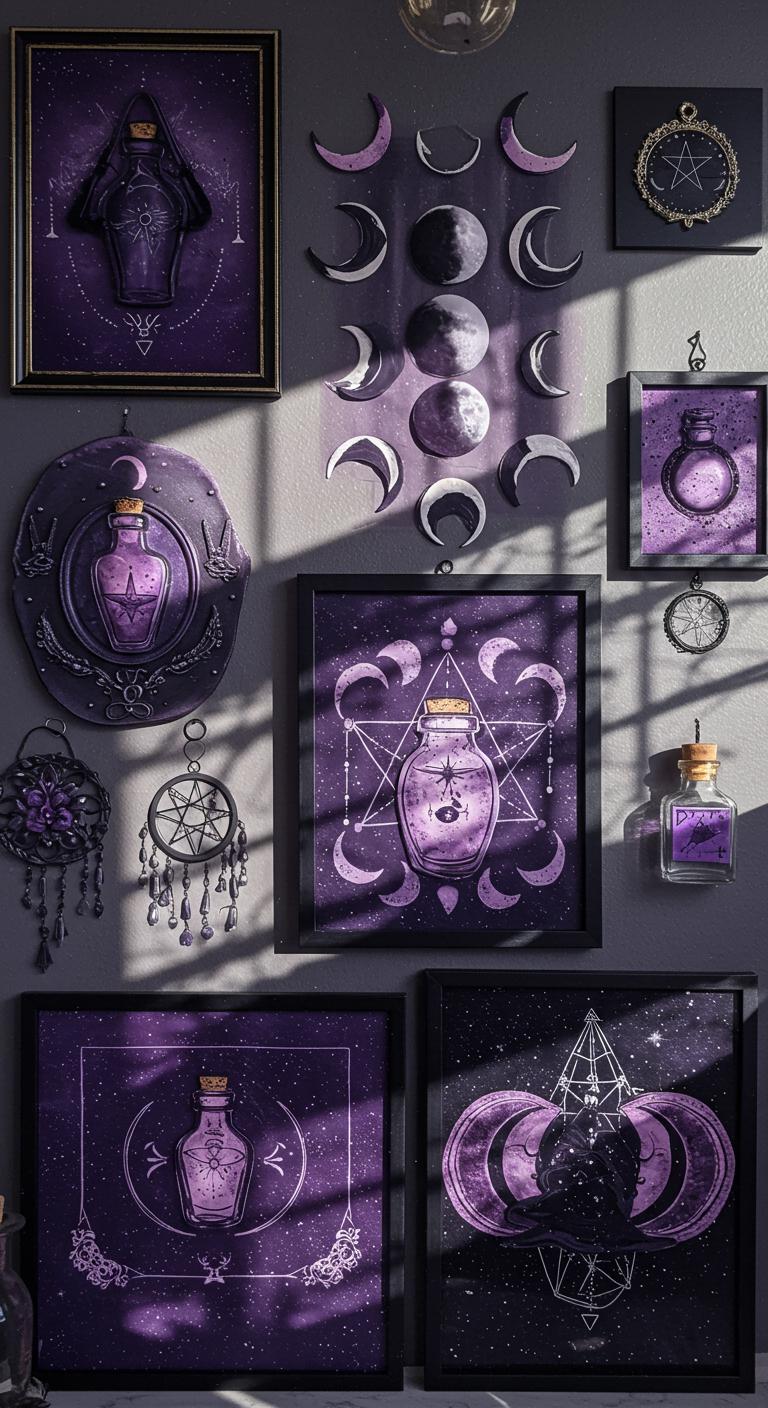 Transform your walls into a gallery of witchy themes with DIY art. Use black paper, paint, and stamps to create DIY wall art. Draw symbols, potions, or spells that resonate with you. You can frame these pieces with thrifted frames or simply hang them up with washi tape for a casual look. The best part? All supplies are budget-friendly. Showcase your art throughout the holiday season to elevate the witchy vibe.