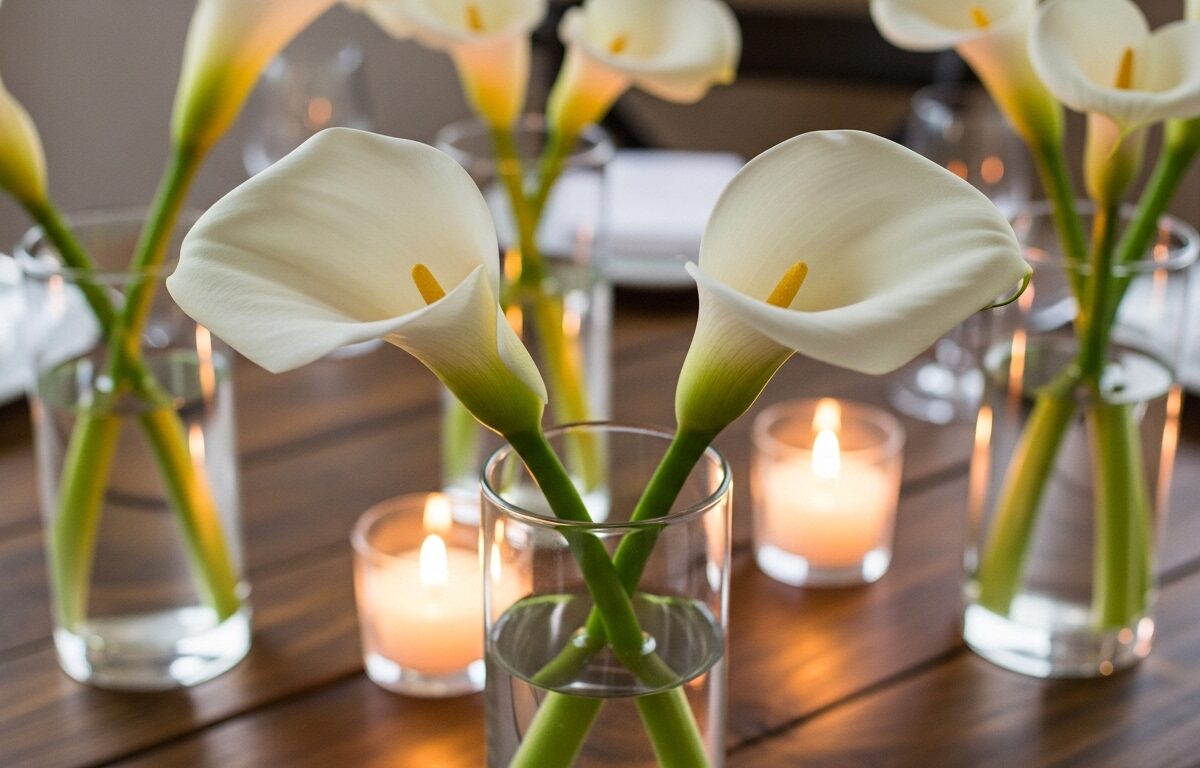 A single vase bursting with calla lilies surrounded by flickering candles? Intimate and luxe. The way the light dances off the petals makes everything feel magical – ideal for evening dinners. Pro tip: unscented candles so the lily scent shines.