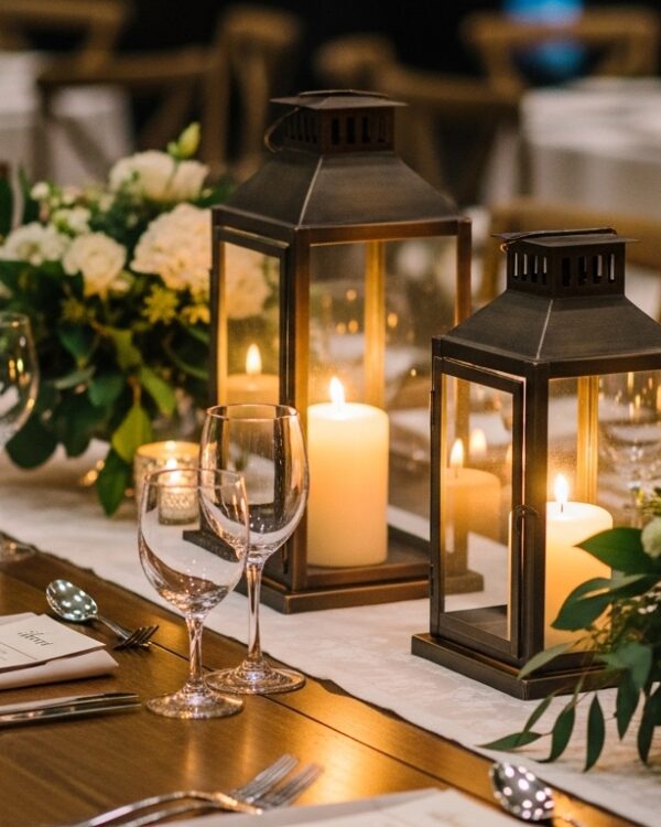 Two vases of white lilies bookended by lit candles on the table. Cozy yet elegant – the flames make it all warm and inviting. Perfect if you’re going for that golden-hour reception glow.