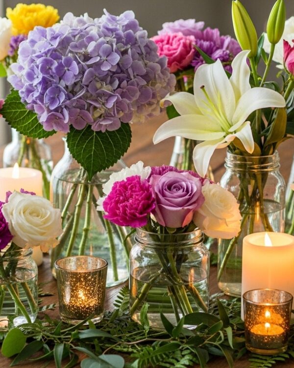 White calla lilies next to lit candles on the table – cozy factor maxed. I light these for girls’ night; sets the chill tone instantly. Tiny flicker, big impact.
