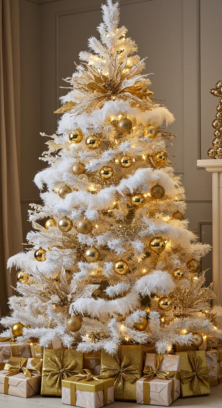 As you step into a winter wonderland, imagine an elegant white and gold Christmas tree adorned with feathery accents that dance like delicate snowflakes.