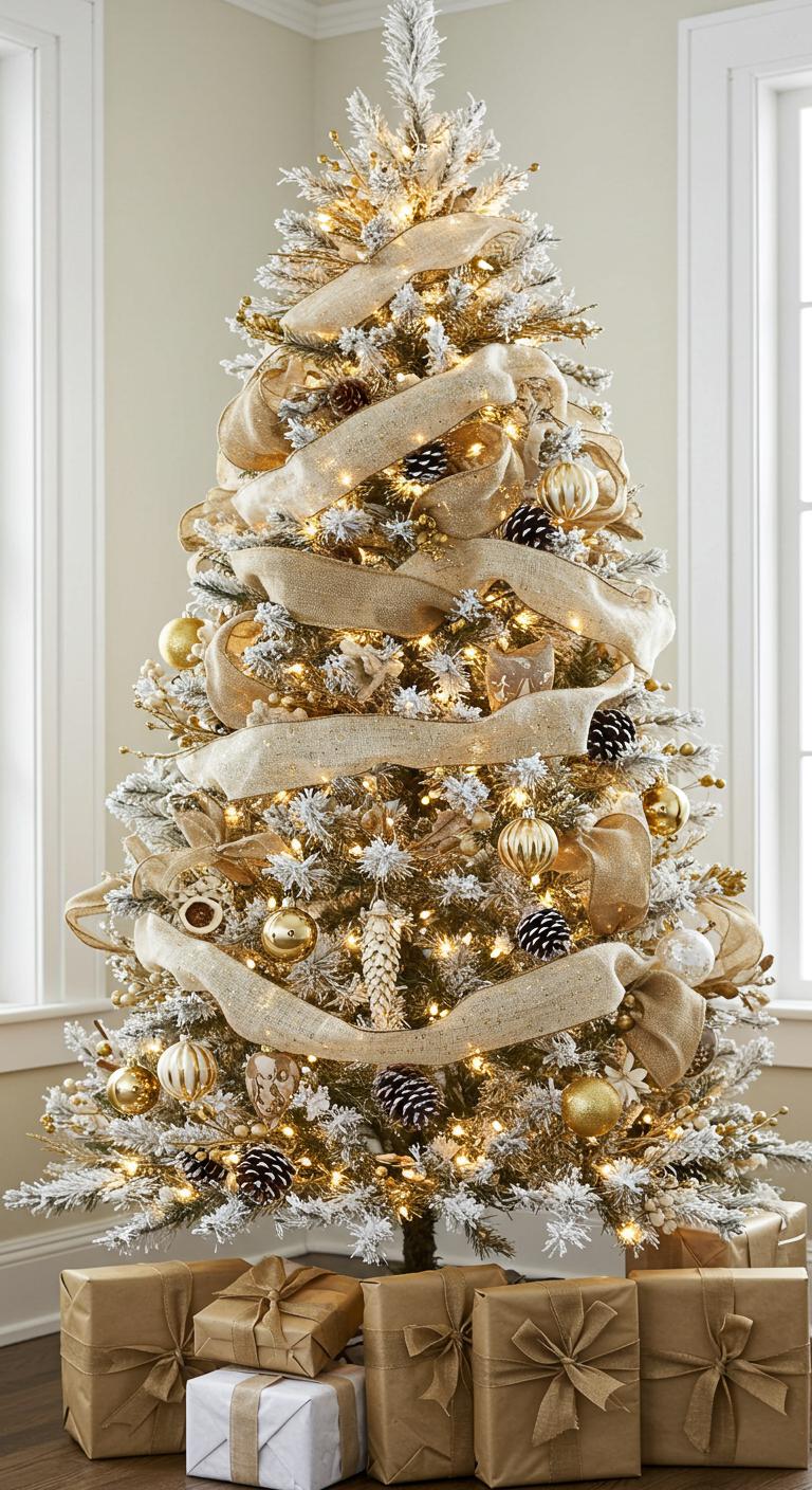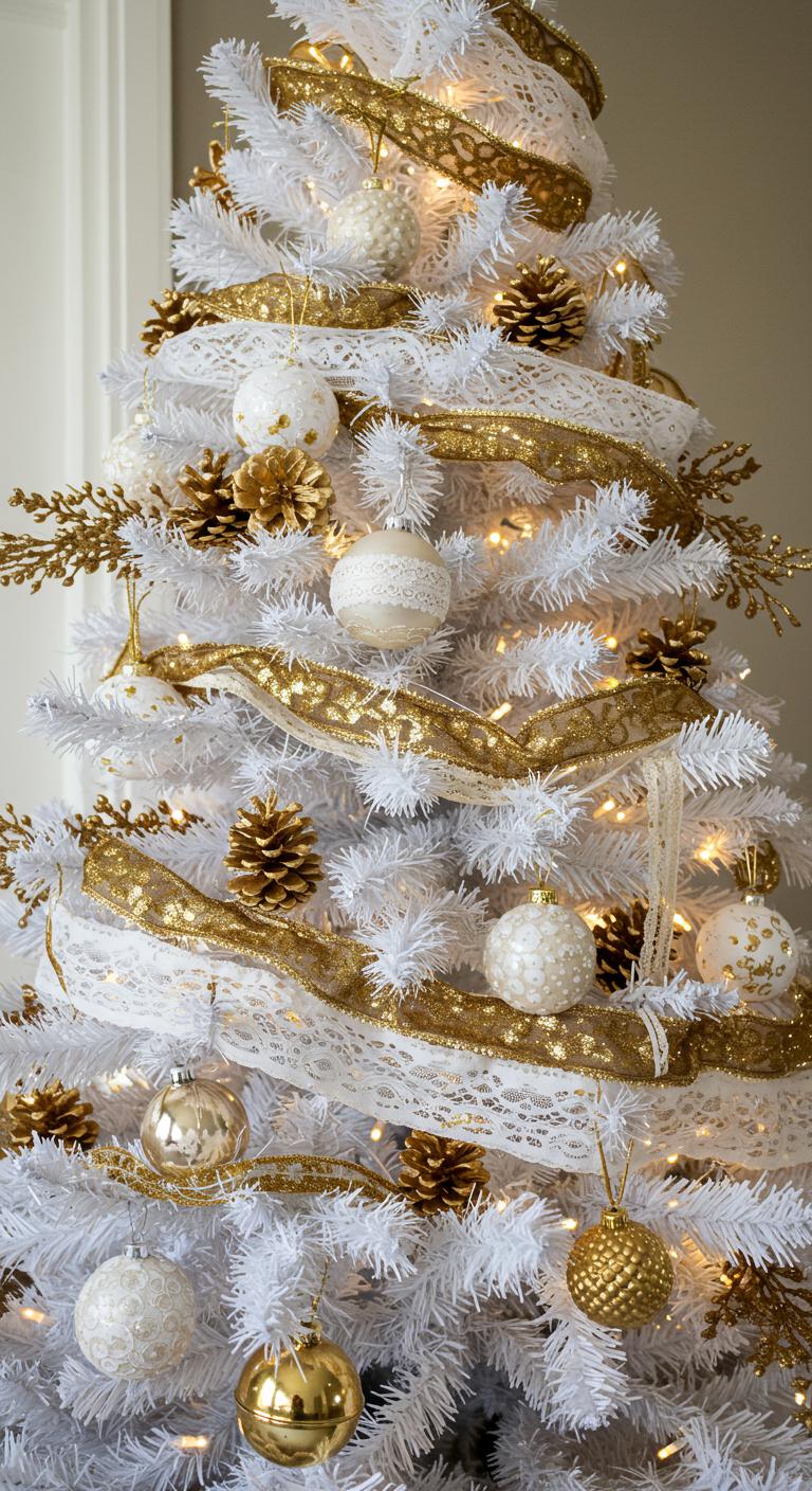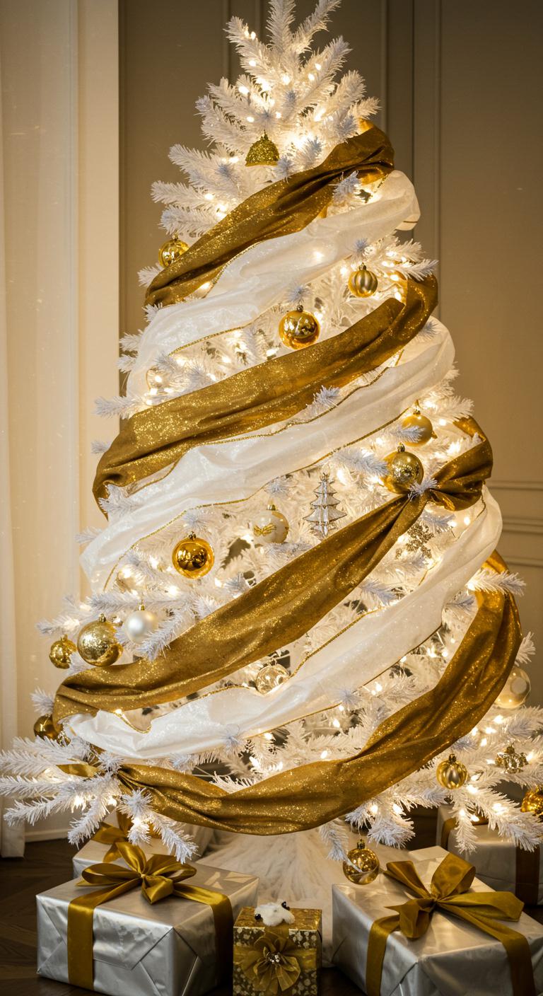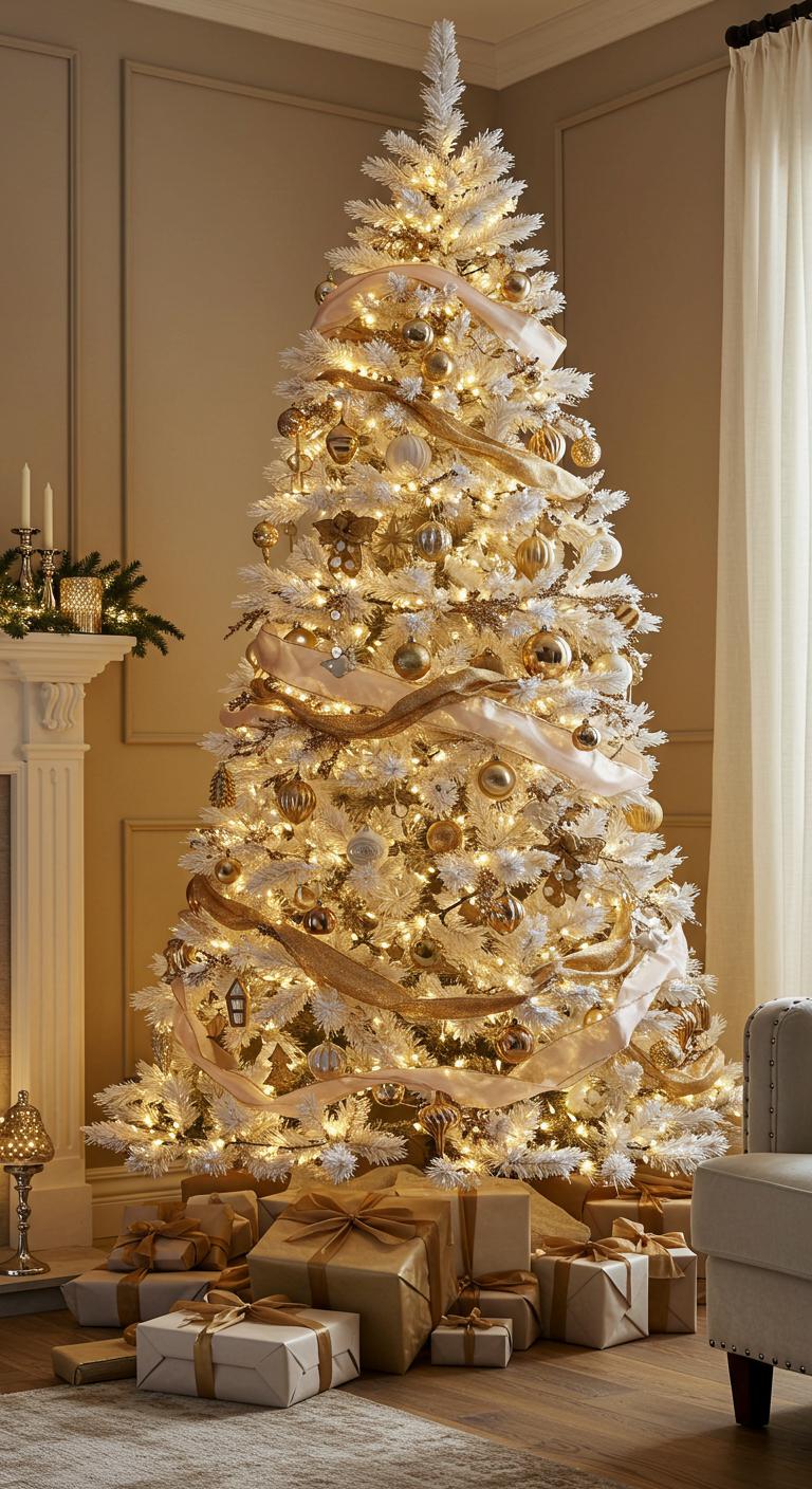 When you envision a timeless holiday aesthetic, a classic white tree adorned with gold ribbon details perfectly captures that elegance.