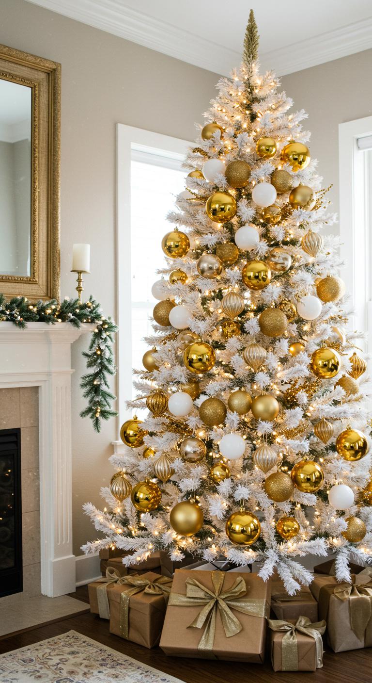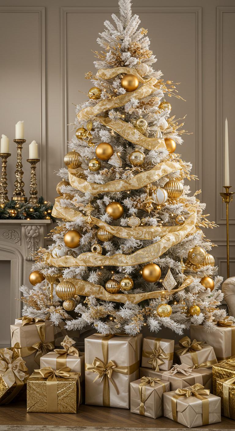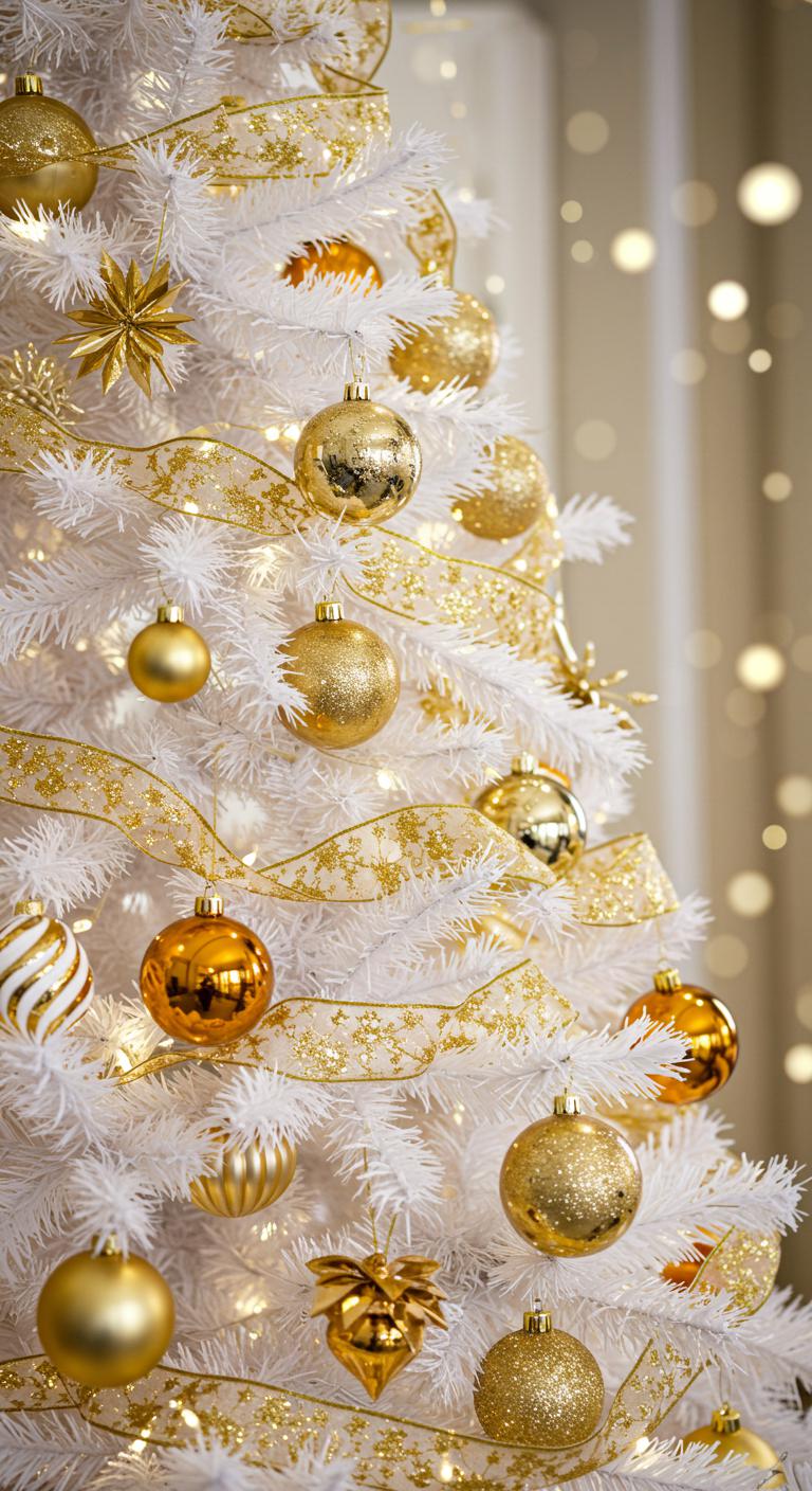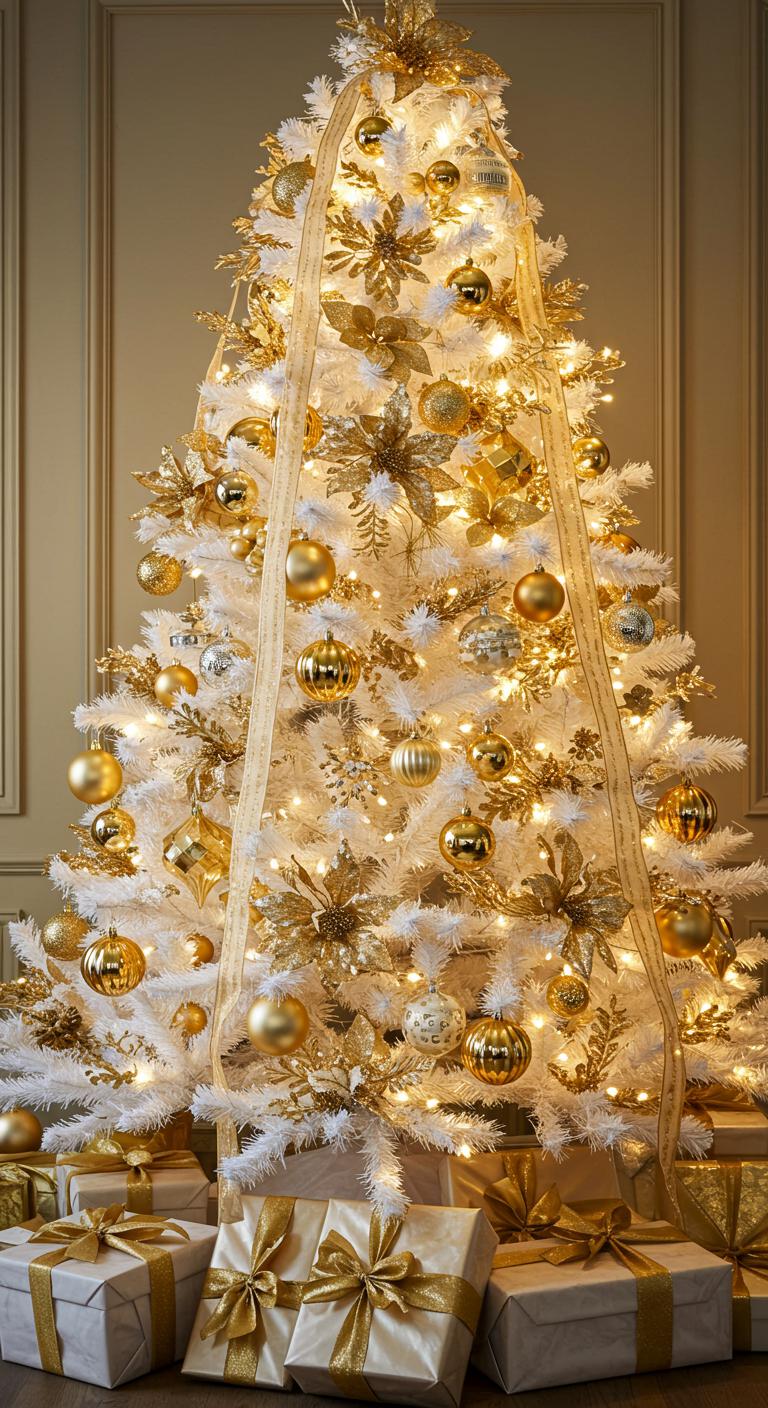 When you want to elevate your holiday decor, a shimmering white and gold tree adorned with metallic accents can transform your space into a winter wonderland.