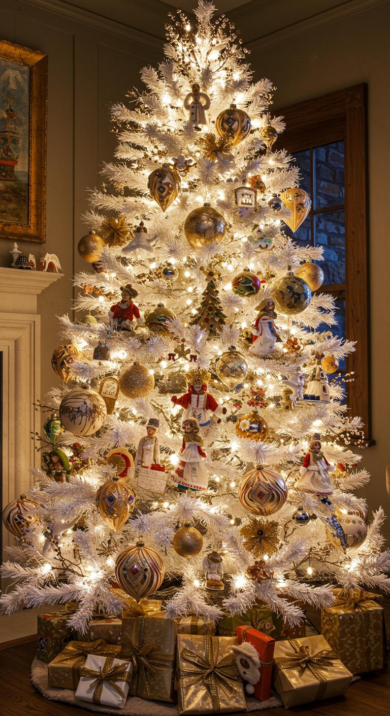 Transform your holiday decor into a masterpiece with an artistic white and gold tree that features unique ornaments.