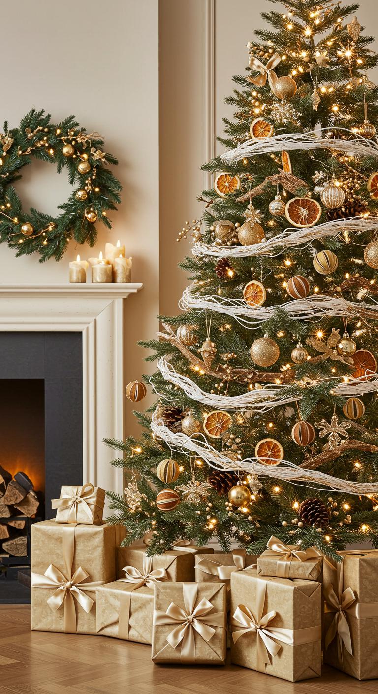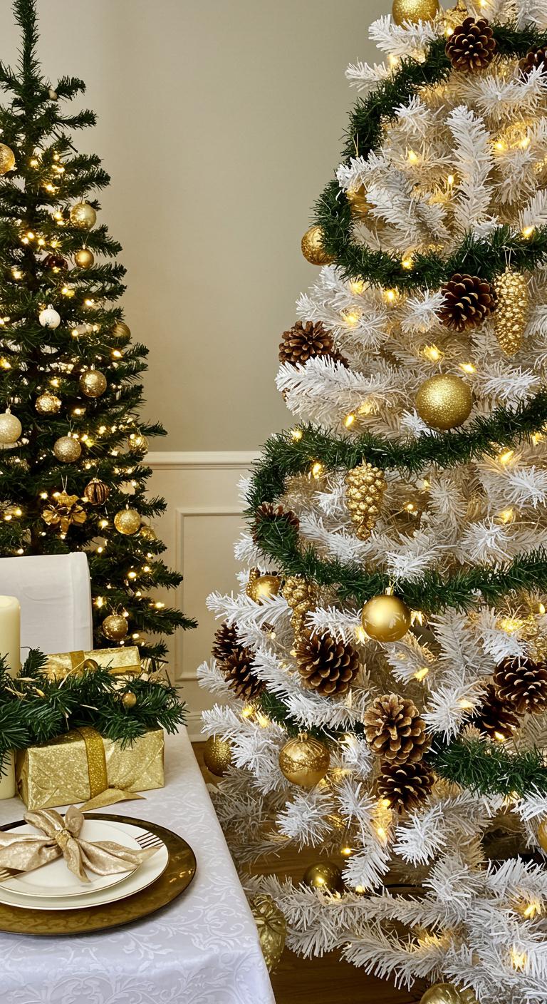 To elevate your holiday decor, consider a festive white and gold tree that beautifully incorporates natural elements.