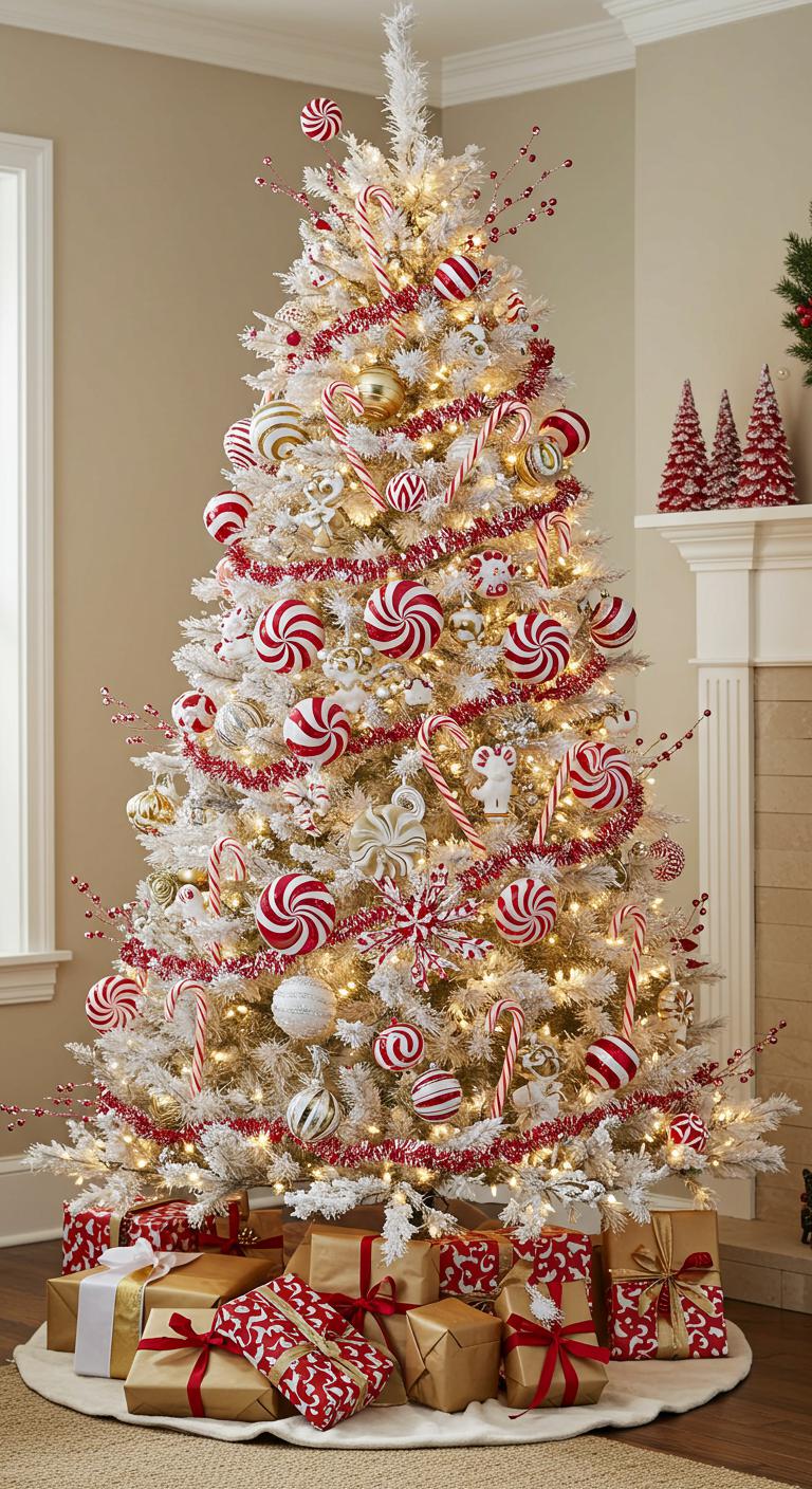 As you embrace the holiday spirit, consider a charming white and gold tree that incorporates delightful candy cane touches.