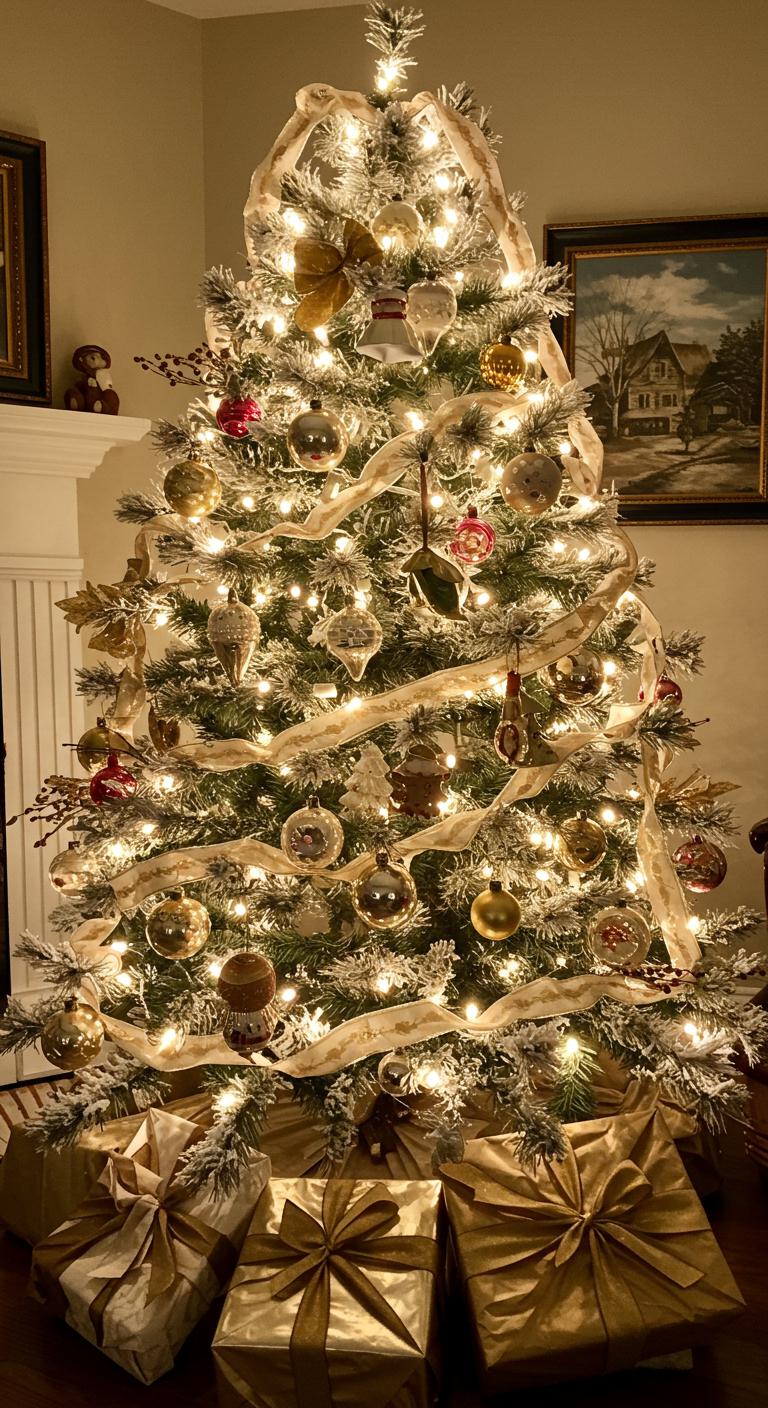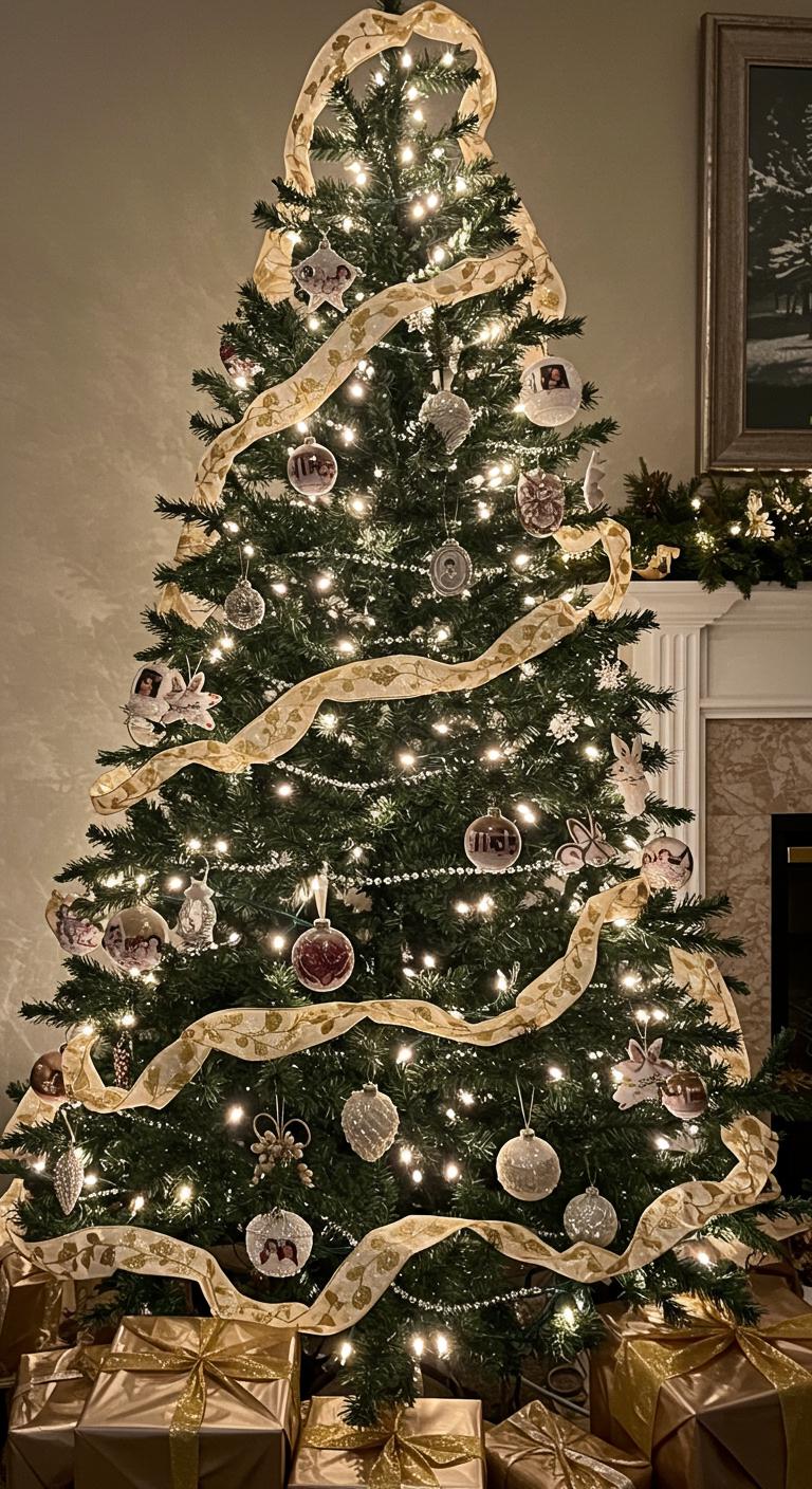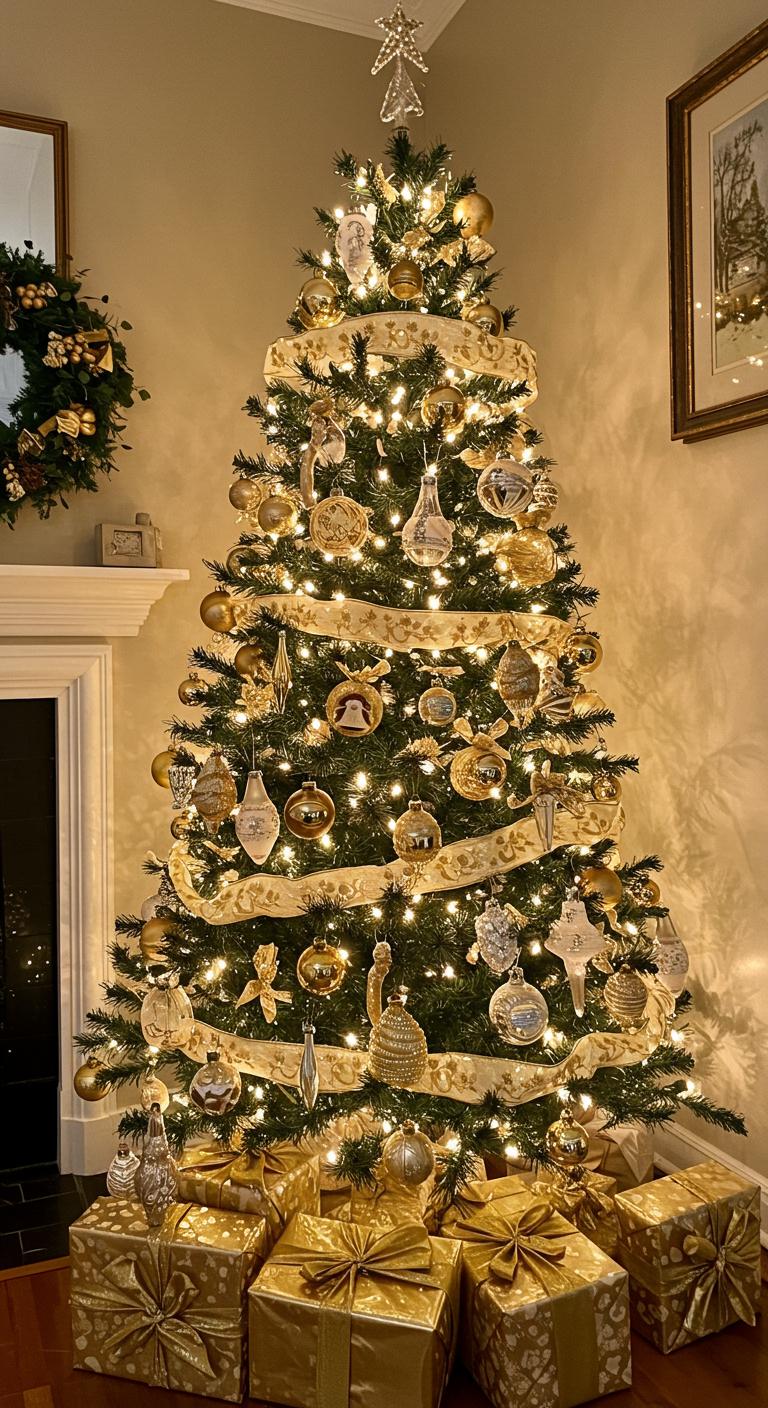Each branch sparkles with sentimental ornaments, telling stories of generations past. Delicate gold ribbons weave through white lights, enhancing the timeless elegance.