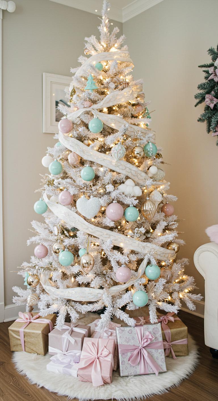 Adorn your tree with delicate pastel ornaments in shades of blush, mint, and lavender, creating a whimsical touch.