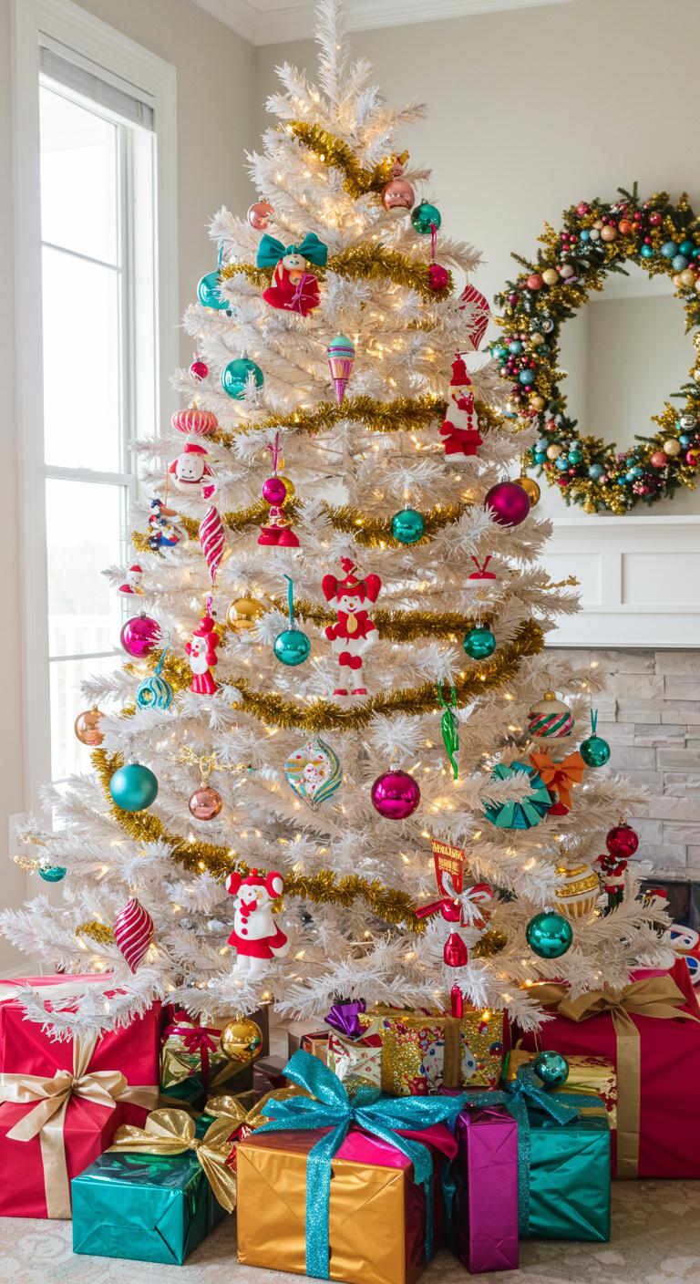Imagine stepping into a holiday wonderland where a bright white and gold tree bursts with colorful pops of festive cheer.