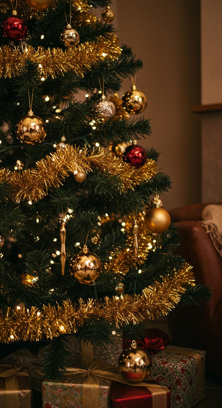 As you embrace the charm of nostalgia, a classic tinsel and gold Christmas tree transforms your holiday space into a retro haven.