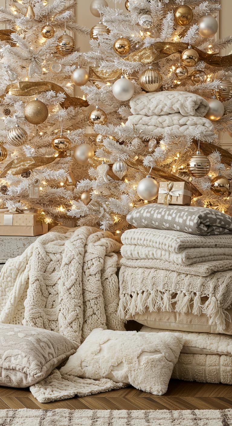 Picture glittering gold baubles dancing against textured whites, creating a dazzling contrast that captures the eye.