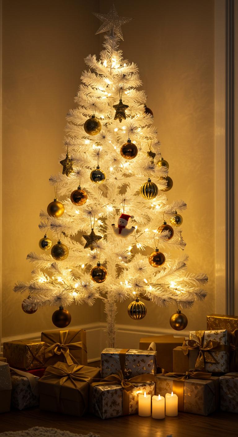 A stunning white Christmas tree adorned with opulent gold leaf accents transforms your holiday decor into a luxurious spectacle.