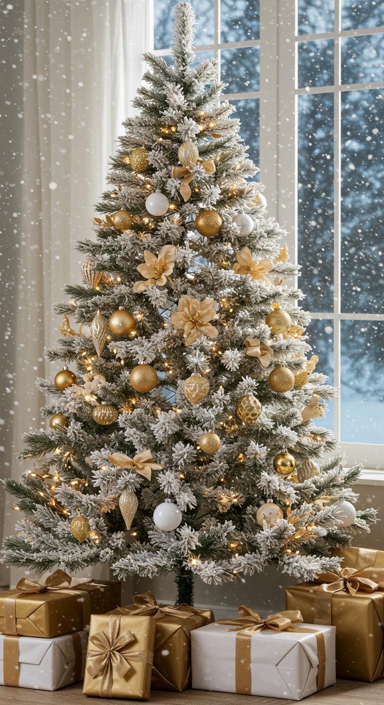 As you step into a winter wonderland, a frosted white and gold Christmas tree captures the essence of the season’s magic.