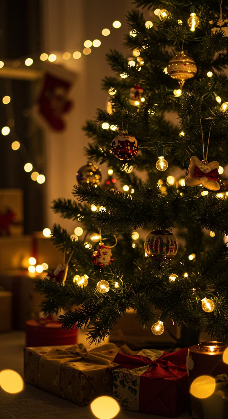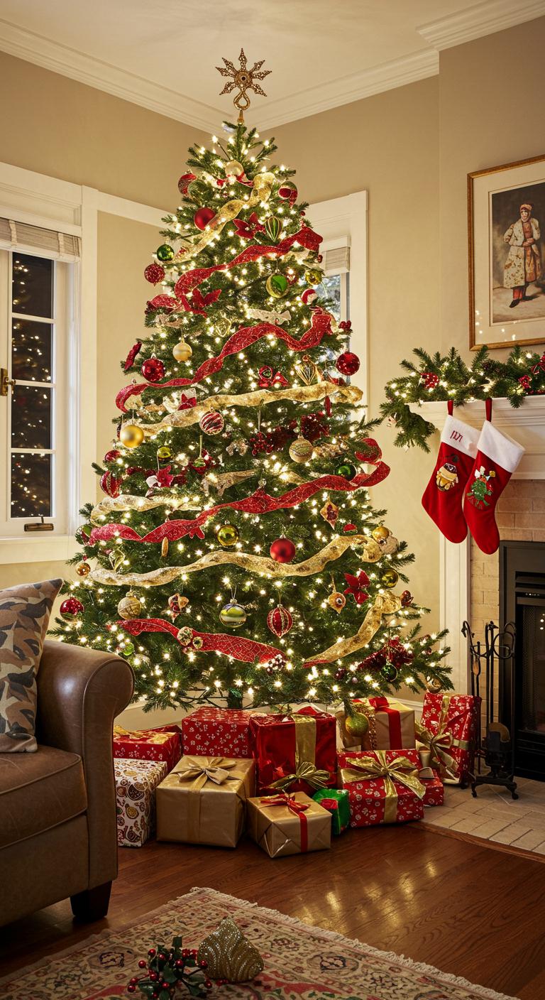Adorn your tree with traditional ornaments that sparkle in the soft glow of lights, while festive garlands drape gracefully around the branches.