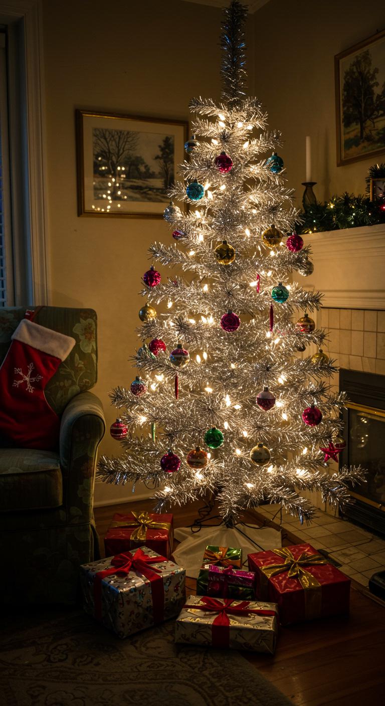 As you step into the enchanting world of a vintage silver tinsel tree, a shimmer of nostalgia envelops you, reminiscent of holiday celebrations from decades past.