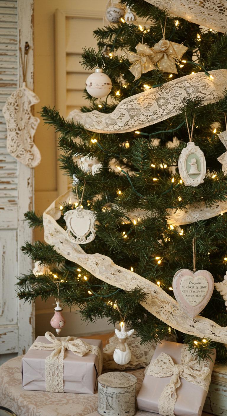 Picture a tree adorned with delicate lace, weathered wood ornaments, and soft pastel accents. Twinkling fairy lights wrap around branches, casting a cozy glow.