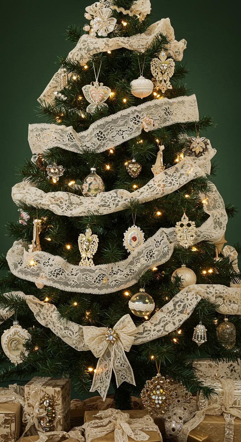Adorn your tree with vintage lace and lace trimmings, intertwining delicate embellishments and intricate patterns.