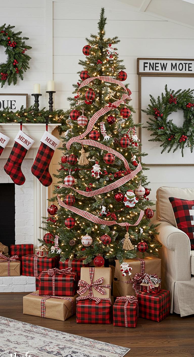 The charm of farmhouse style with plaid transforms your Christmas tree into a cozy centerpiece that invites warmth and nostalgia.