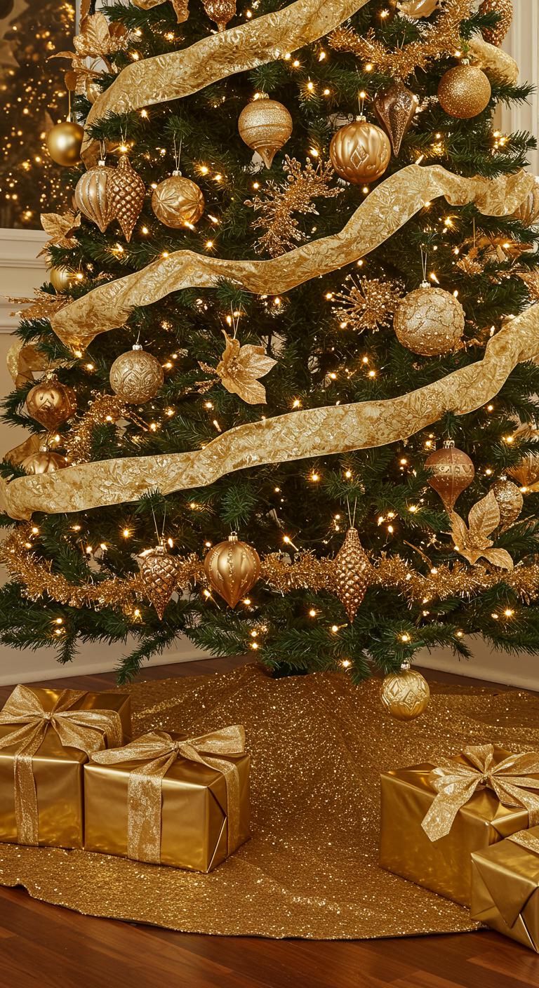 Envelop your tree in a luxurious golden tree skirt that catches the eye, and drape elegant ribbon garlands with flowing grace.