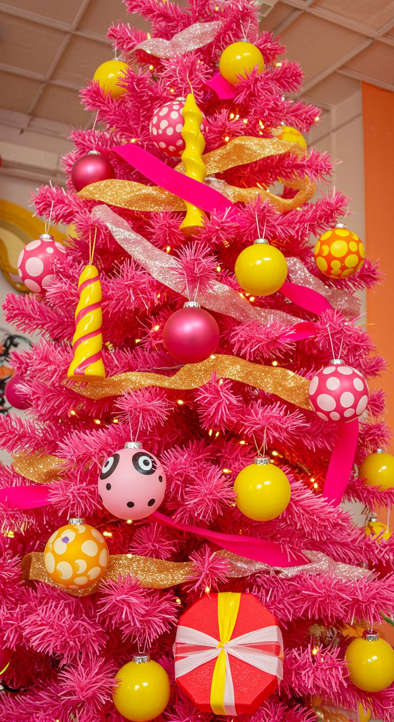 Adorn it with delightful pop art ornaments that dance with whimsy, showcasing vibrant colorways like electric pinks and sunny yellows.