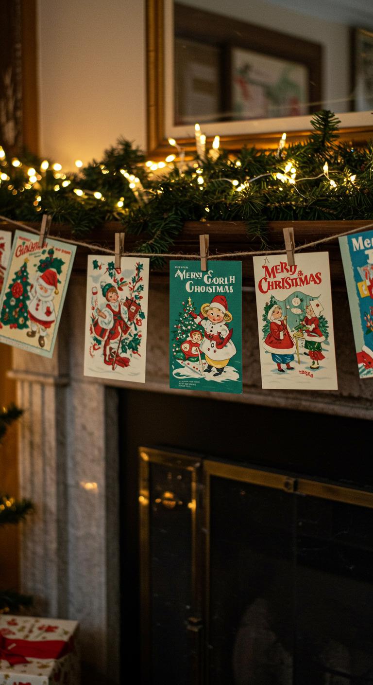 Hang strings of colorful cards from yesteryears, each one a treasure of nostalgic greetings and festive sentiments.