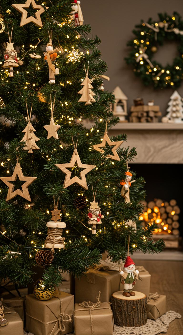 Handcrafted wooden decorations add a rustic charm to your Christmas tree, creating a warm and inviting atmosphere.