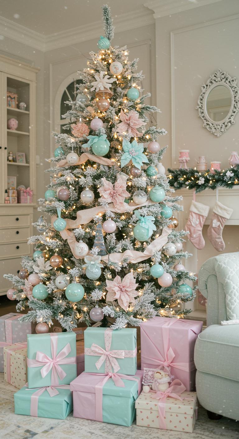 Adorn your tree with delicate pastel ornaments, blending shades of mint green, blush pink, and baby blue.