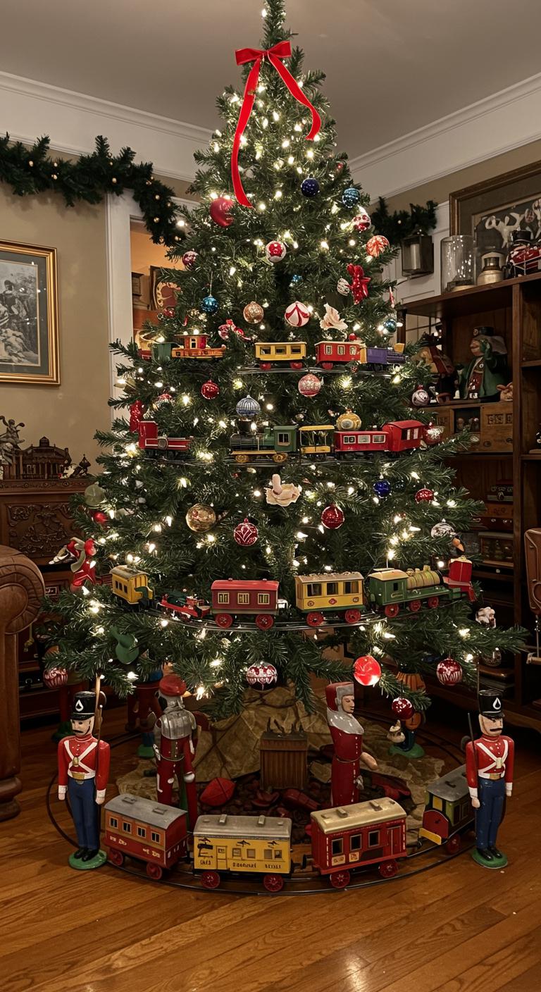 Delicate vintage toy trains weave through the branches, their bright colors sparking nostalgia.