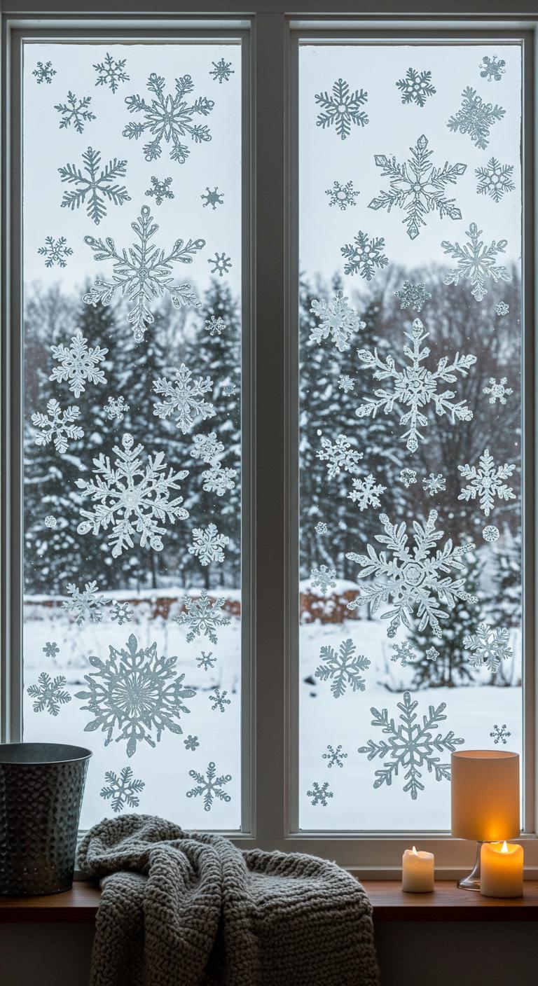 Just cut out various snowflake designs from adhesive vinyl or paper, then stick them on your windows. You’ll instantly create a magical atmosphere that captures the beauty of the season.