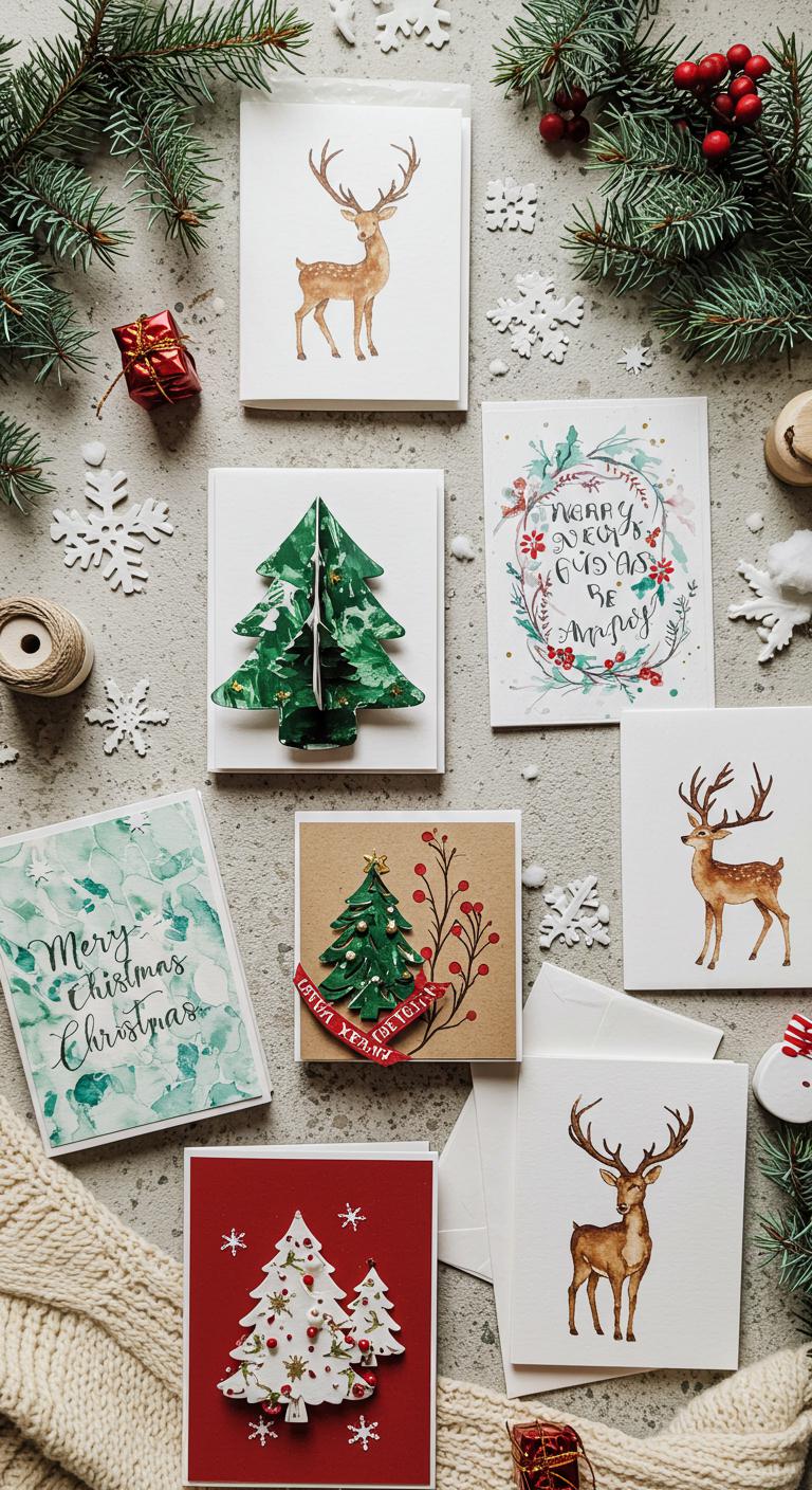 Immerse yourself in handmade card ideas like pop-up trees or simple watercolor designs. Use seasonal card designs featuring snowflakes or reindeer to spread joy.