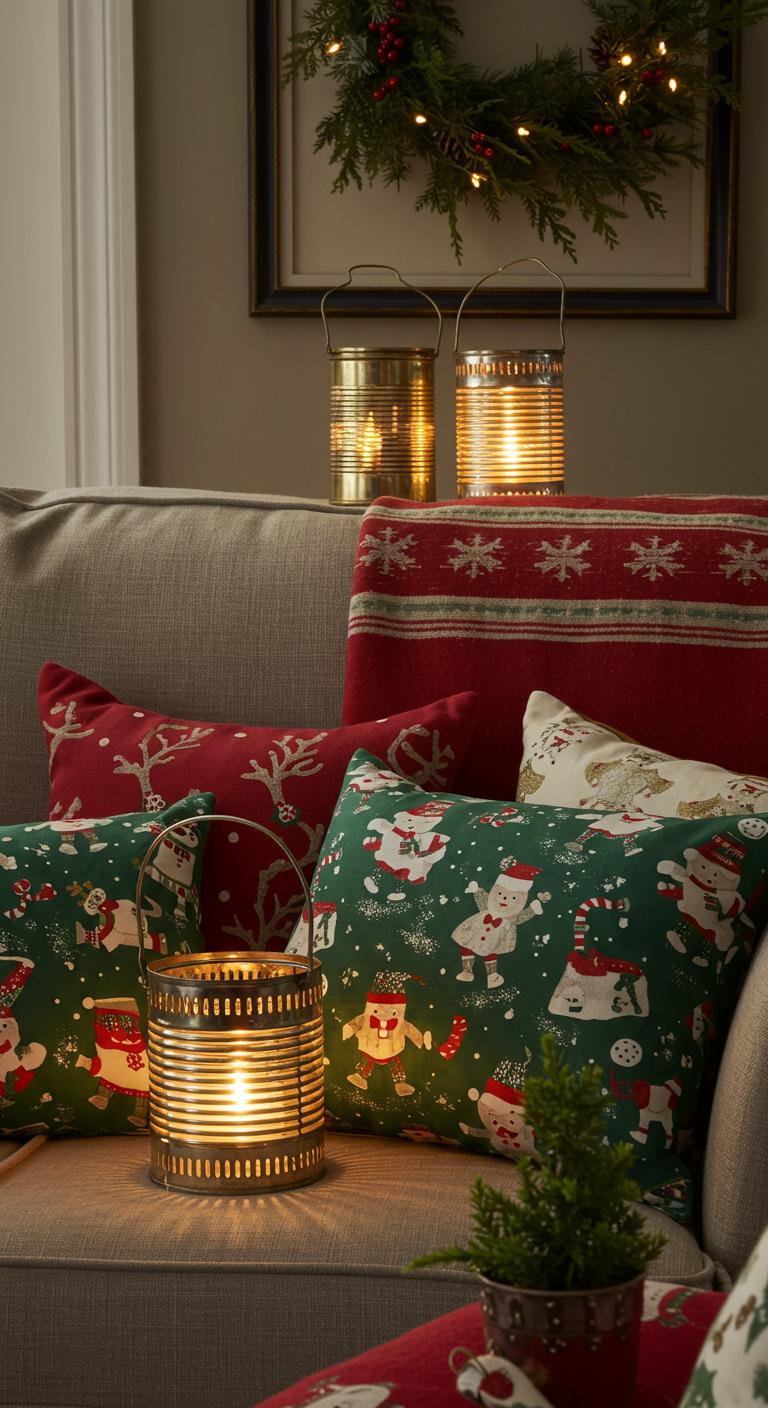 After enjoying the warm glow of your vintage tin can lanterns, why not elevate your festive atmosphere even further with holiday-themed pillows?