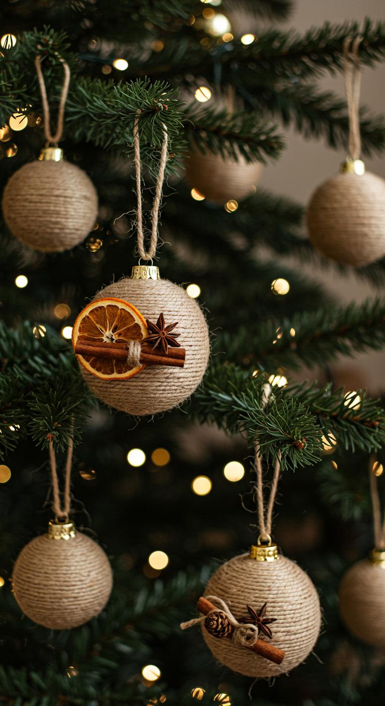 Twine-wrapped Christmas balls are a charming addition to your holiday decor, offering a rustic and cozy touch.