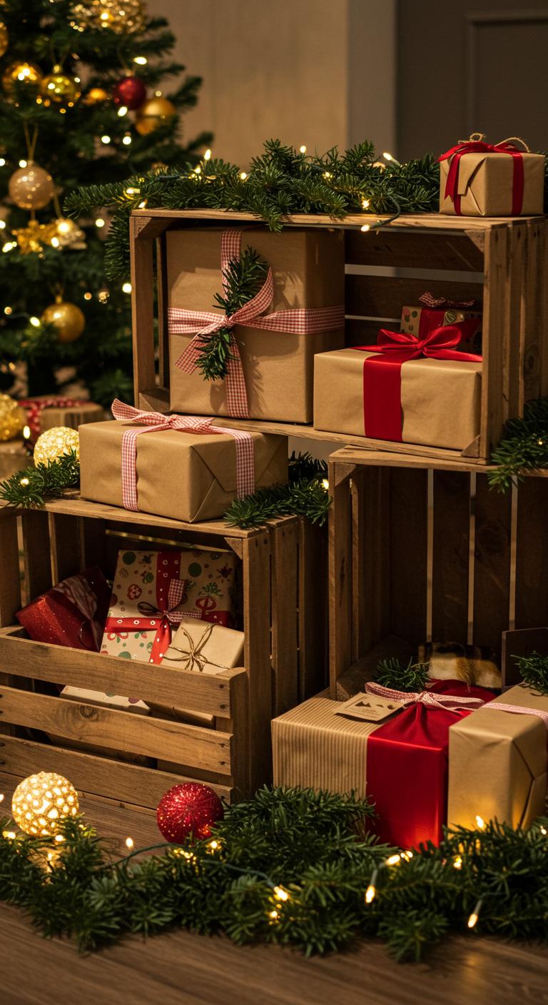 Stack them creatively, fill them with goodies, and decorate with greenery or ornaments for festive crate displays.