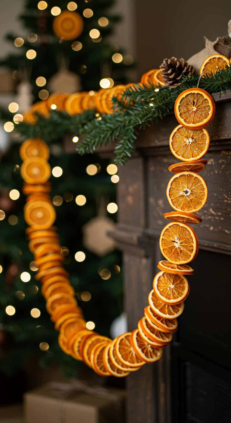 Dried orange slice garland adds a vibrant and fragrant touch to your holiday decor, perfect for draping over mantels or adorning your Christmas tree. With a bit of dried fruit preservation, you can create a stunning festive garland assembly. Simply slice, dry, and string your oranges together for a cheerful, homemade decoration that embodies the spirit of the season. Enjoy the process!