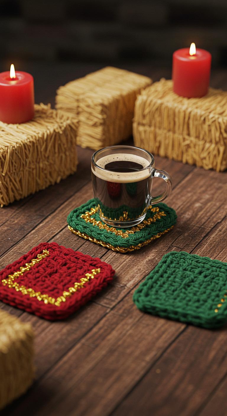 After adding those charming miniature hay bales to your decor, why not elevate your holiday gatherings even further with some cozy, knitted holiday coasters?