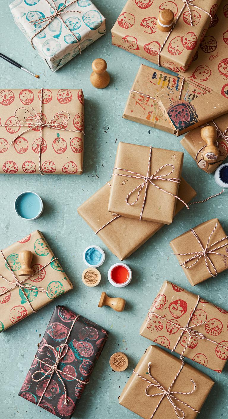 Use simple hand stamped techniques like potatoes or foam stamps to craft unique wrapping paper designs.