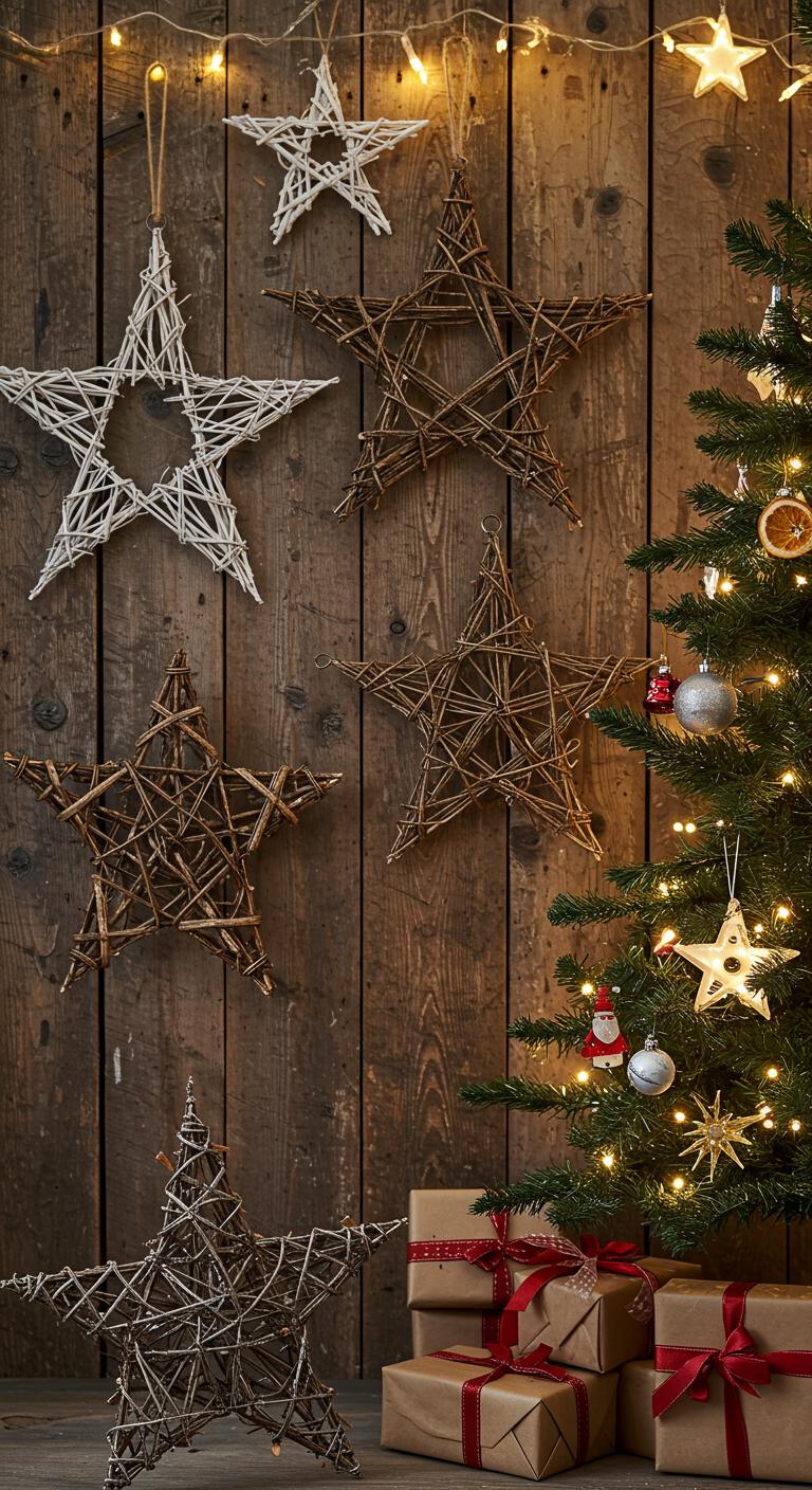 Create unique twig star designs by gathering twigs of varying lengths and binding them together with twine or wire. Hang them on your tree or walls for a rustic touch.