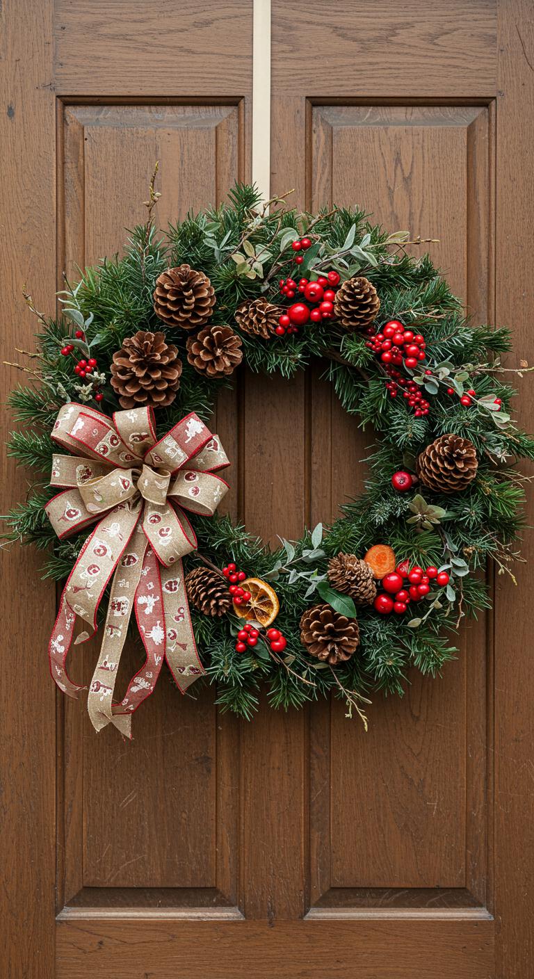 Create a stunning country-style wreath using natural elements like pinecones, twigs, and evergreen branches. Add splashes of festive colors with berries or ribbons.