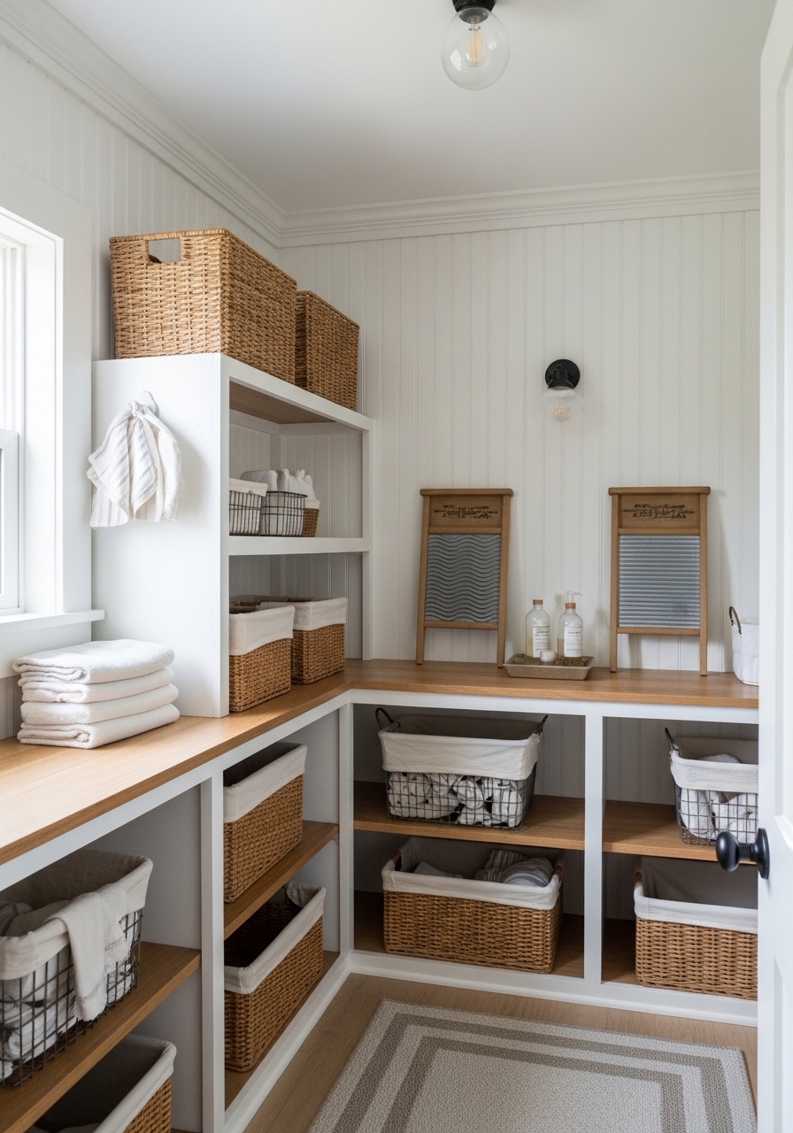 Organizing your laundry room with open shelves and woven baskets turns a chore space into a charming spot. I added this to mine and now folding clothes feels less tedious. Use labeled bins for detergents and hang a drying rack for that authentic touch. It’s all about making everyday tasks a bit more enjoyable.