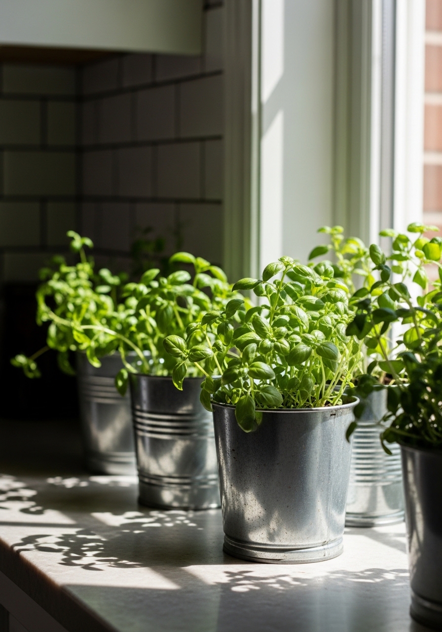 Setting up a small herb garden on your kitchen windowsill keeps fresh flavors at hand while enhancing the decor. I grow basil and mint this way, and it smells amazing when I cook. Use mismatched tins for that eclectic farmhouse feel. Water them regularly, but don’t overdo it – learned that the hard way.