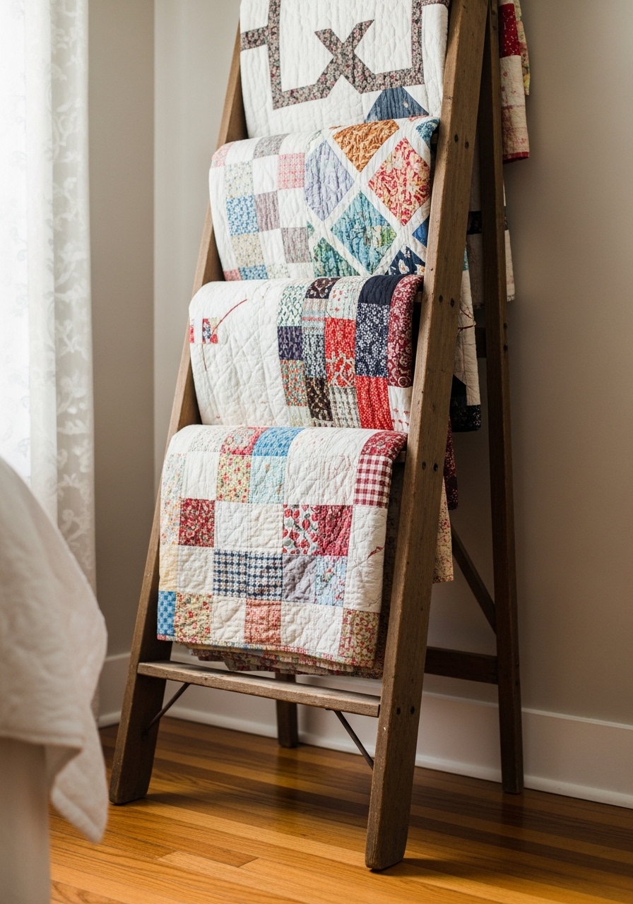 Using a ladder as a quilt rack showcases your favorite textiles and adds vertical interest. I inherited a few quilts and displaying them this way keeps them accessible yet decorative. Fold them neatly or let them drape for a relaxed vibe. It’s perfect for rotating seasonal pieces.