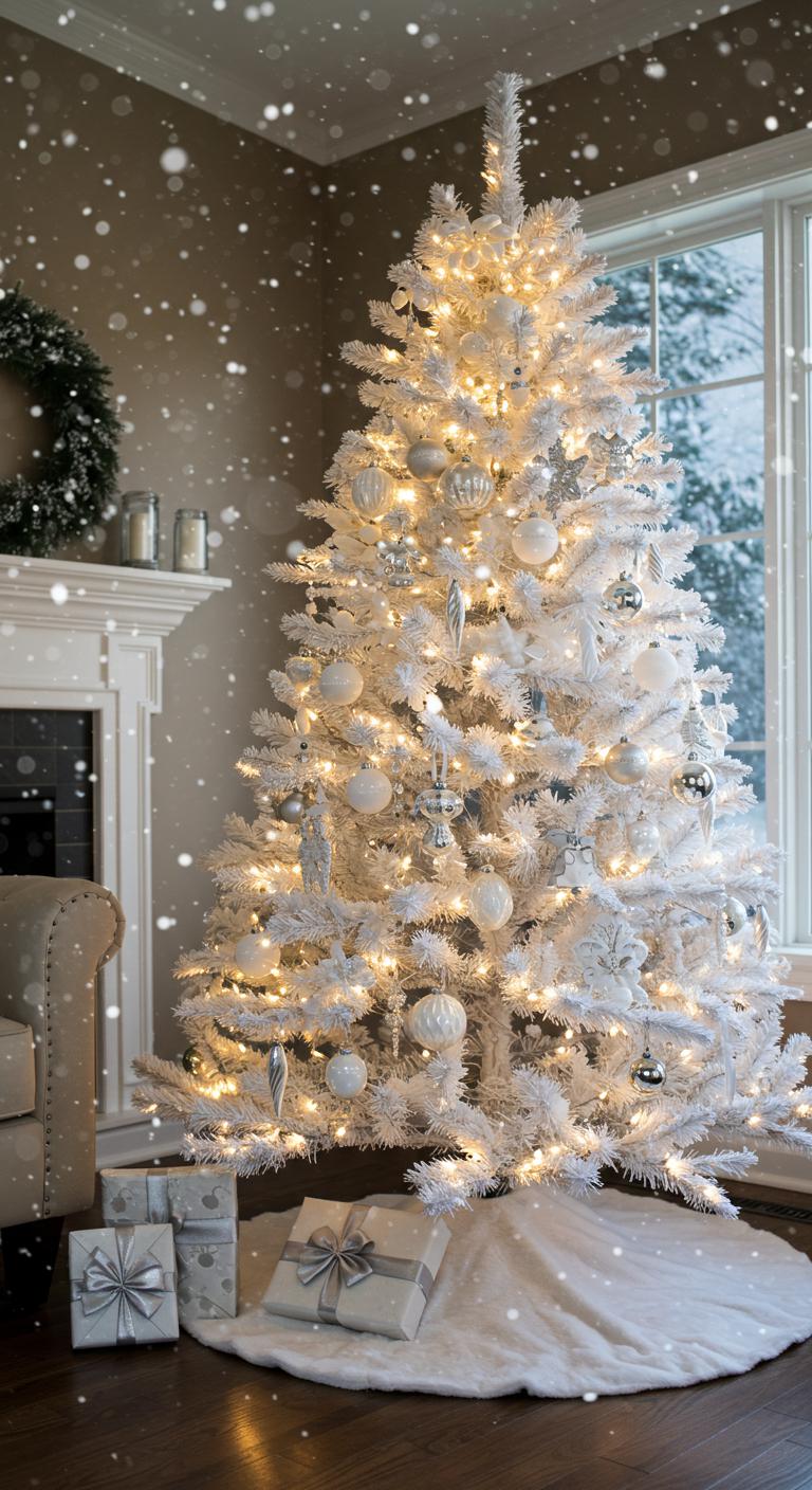 Adorned with classic white ornaments, this tree radiates elegance and simplicity. A snowy tree skirt adds the perfect touch, making it feel like a fresh snowfall.