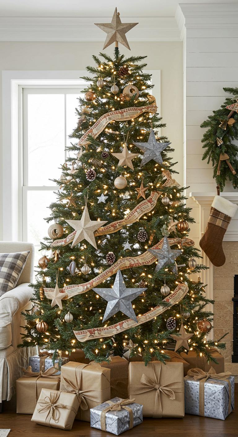 Adorn it with rustic ornaments like wooden stars and burlap ribbons, while integrating farmhouse accents such as galvanized metal and twinkling fairy lights.